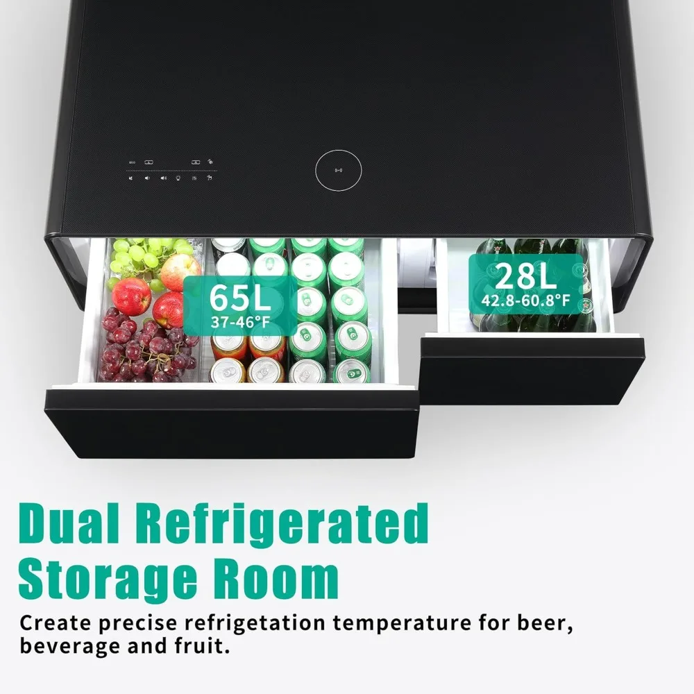 - [Dual-Zone Refrigerated Drawers]: Keep your beverages and snacks at the perfect temperature with our dual-zone refrigerated drawers. The left drawer maintains a cool 37.4-46.4°F, while the right drawer stays at 42.8-60.8°F. You can adjust each drawer’s temperature individually with our intuitive control panel. No more lukewarm drinks or soggy snacks – our smart coffee table ensures every sip and bite is perfectly chilled and refreshing, just the way you like it.