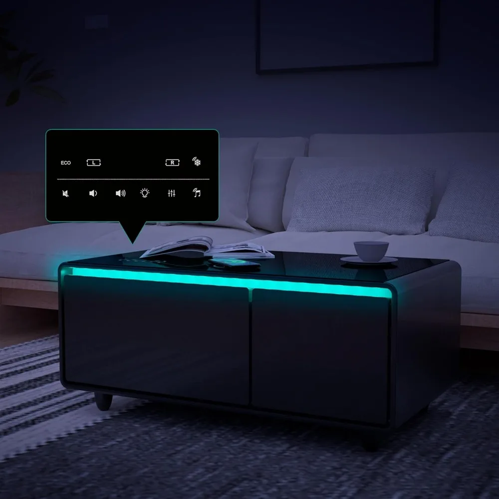 Smart Coffee Table, Built-in Fridge, Bluetooth Speaker, Wireless Charging, Touch Control Panel, Outlet Protection, Coffee Table