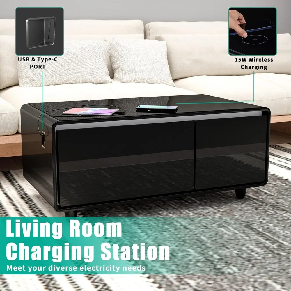 - [USB & Type-C charging port]: There are double USB and a type-c charging ports on the side of the smart coffee table to meet the needs of charging and using electronic devices. Never worry about running out of battery again. The tabletop comes equipped with a 15W wireless charging pad, making it convenient to power up your devices while you relax.