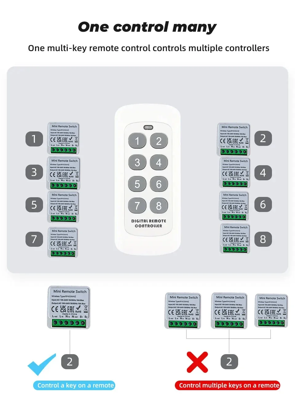 1.This controller will not be available if a wall switch with RF function is installed at home. Otherwise the function will be affected. Just need to buy a separate wireless switch