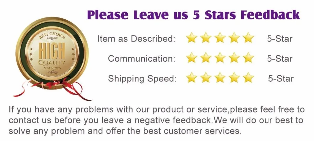 2. If you don't satisfied our porducts, pls contact us before you leave negative feedback or do the detailed rating. We guarantee we will 100% slove any problem for you.