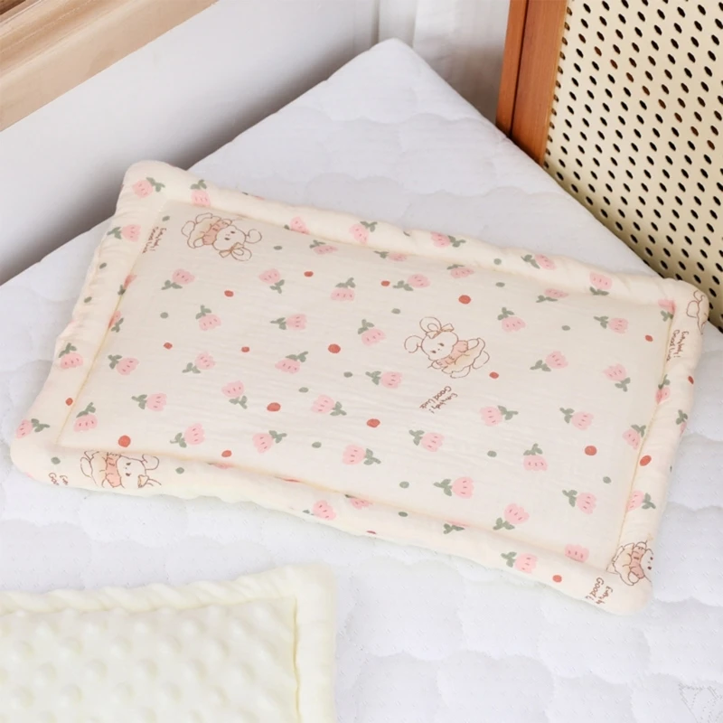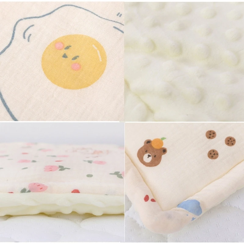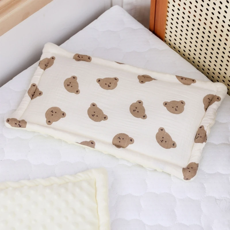 Our Baby Bedding Pillow features a double sided design for versatility. The outer layer is made of cotton gauze, offering a gentle and breathable feel, while the reverse side is plush cotton for added comfort.