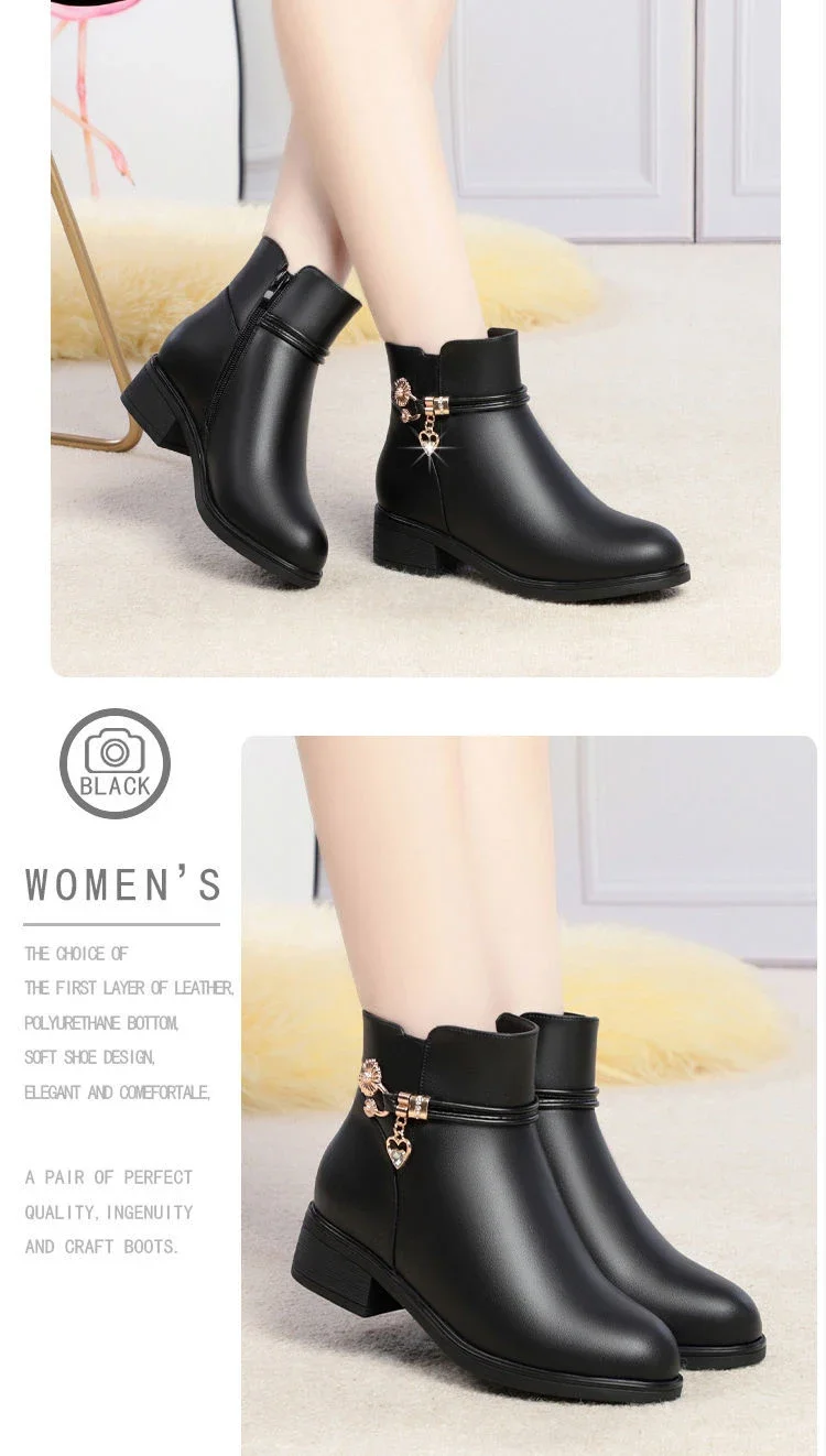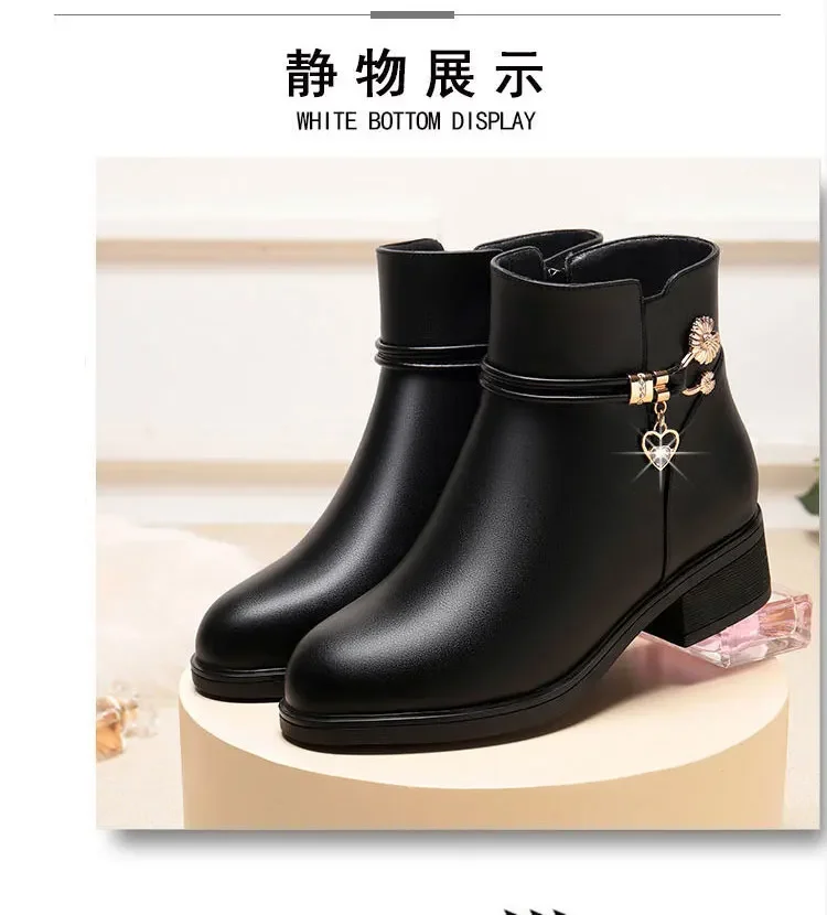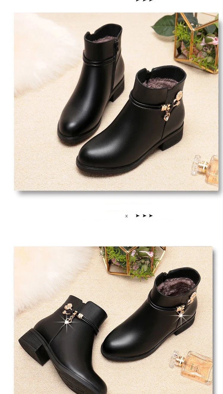 Soft Leather Mom Shoe Spring Winter with/Without Plush Warm Women Snow Boots Soft Sole Med Heel Short Boot Black