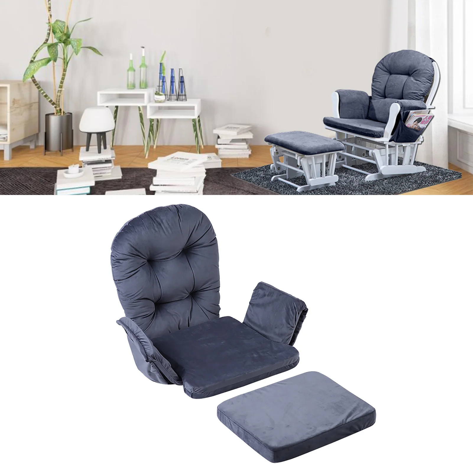This cushion set includes a chair cushion and a stool cushion, fit for your rocking chair perfectly. It adopts velvet fabric and soft cotton, providing you the most comfortable and warm sitting.