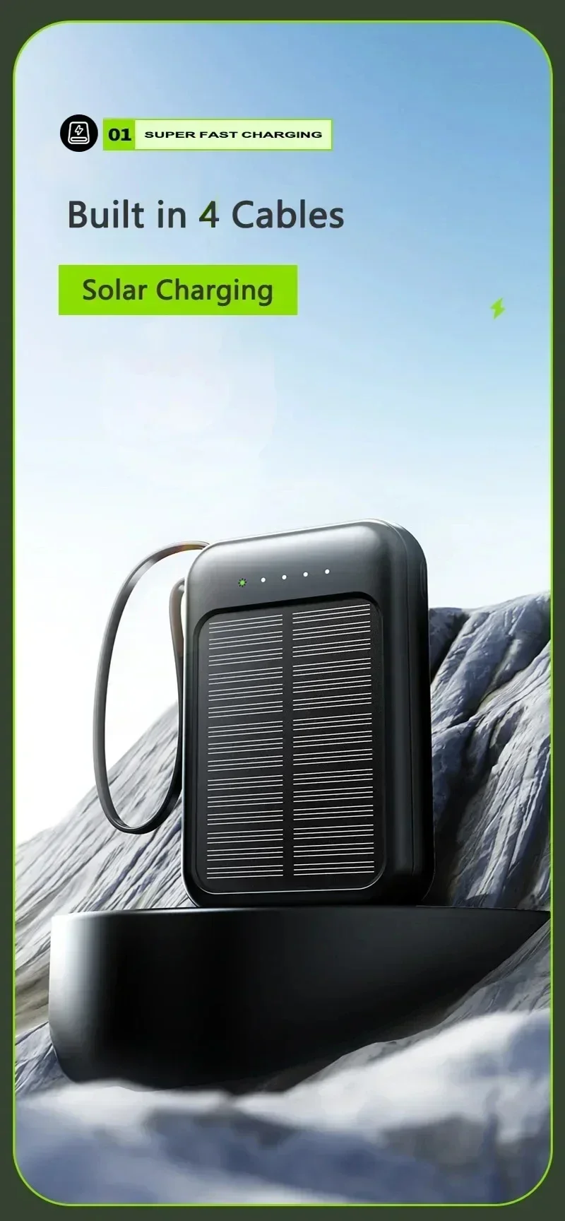 50000mAh Power Bank Solar Super Fast Charging Compact Portable Built-in Cable High Capacity External Battery With Led Light
