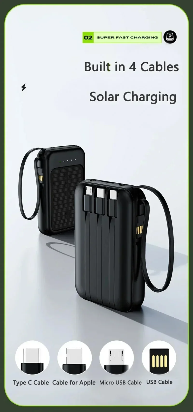 Solar Power Bank 50000mAh Super Fast Charging Compact Portable Built-in 4 Cable High Capacity External Battery With Led Light