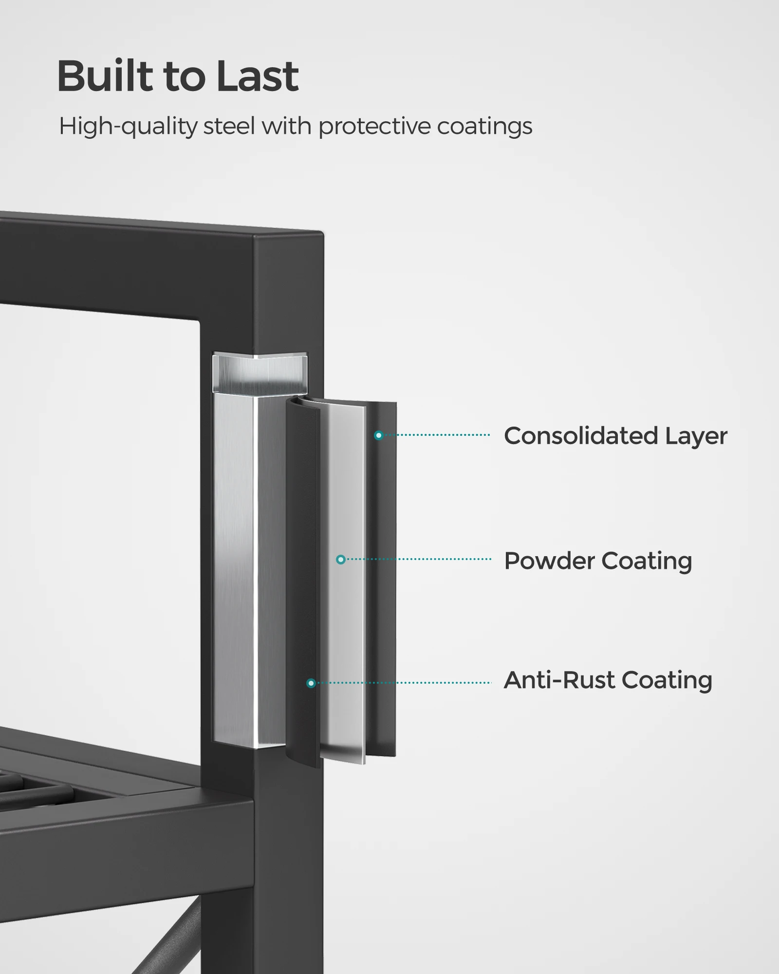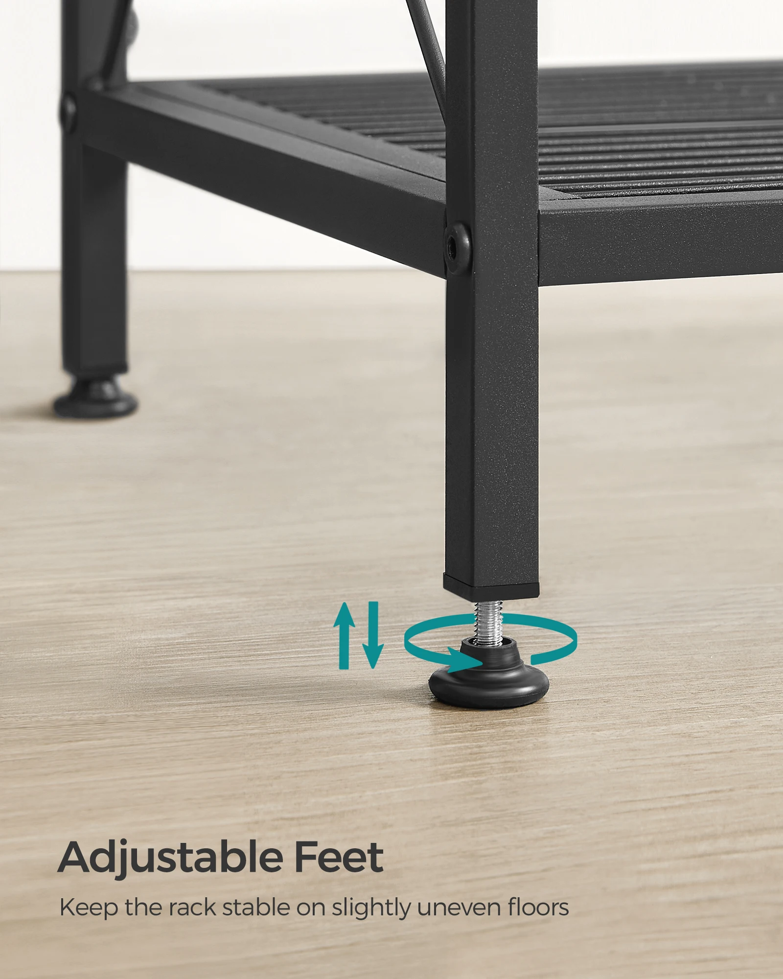 【ADJUSTABLE FEET】The plastic adjustable feet keep this metal storage rack balanced on slightly uneven floors and protect your floor from scratches