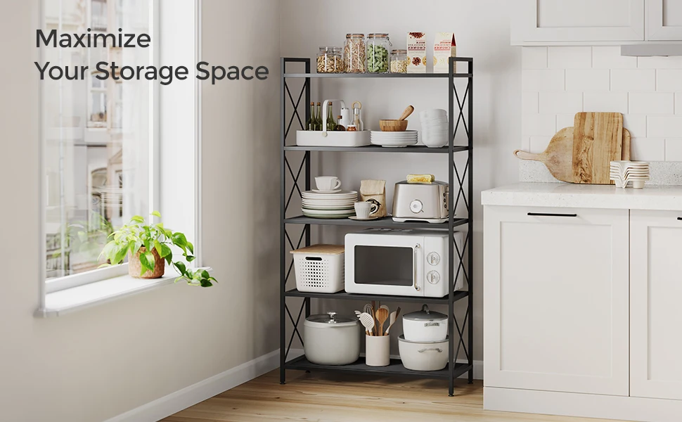 【X SIDE BARS】The X-shaped side bars of this shelving unit help reinforce the structure, protect your items from falling off, and lend a charming flair to your space