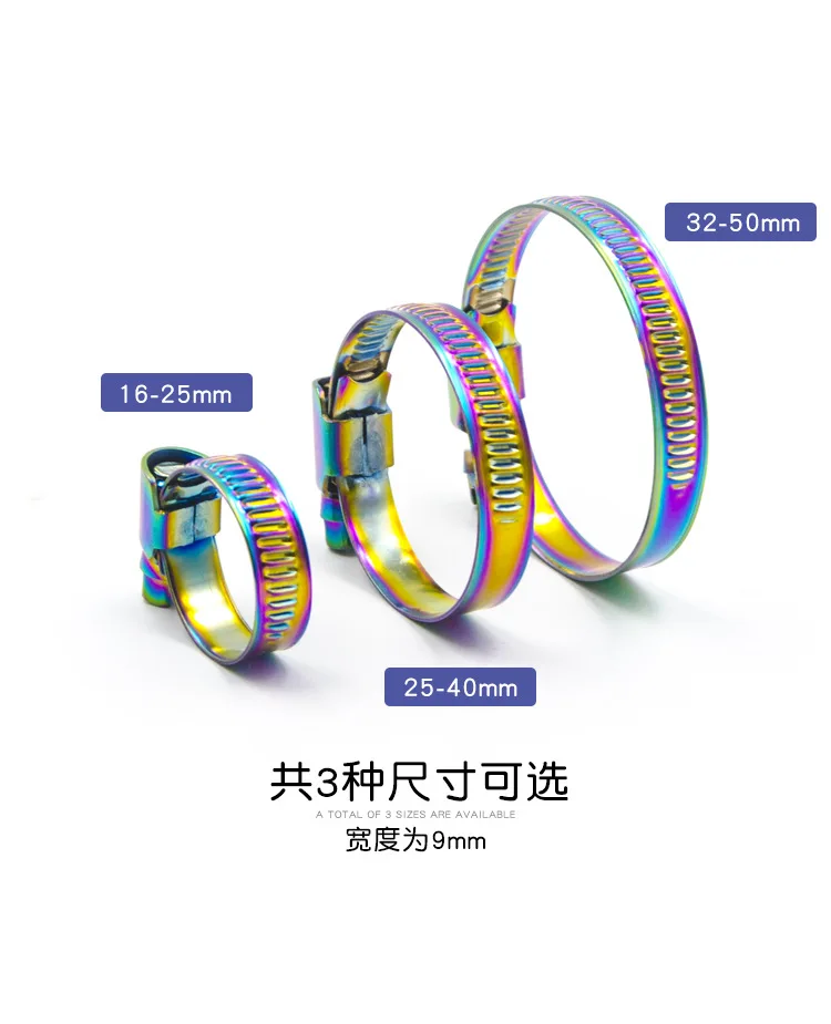 piece Product Name: Stainless steel hose clamp Product material: 304 stainless steel Product application: universal Number of products: one Product features: 304 stainless steel manufacturing, vacuum ion plating, laser cutting process Tips: The color will be different due to the amount of ambient light and the angle, which will cause the picture to deviate from the real thing!Please understand, thank you