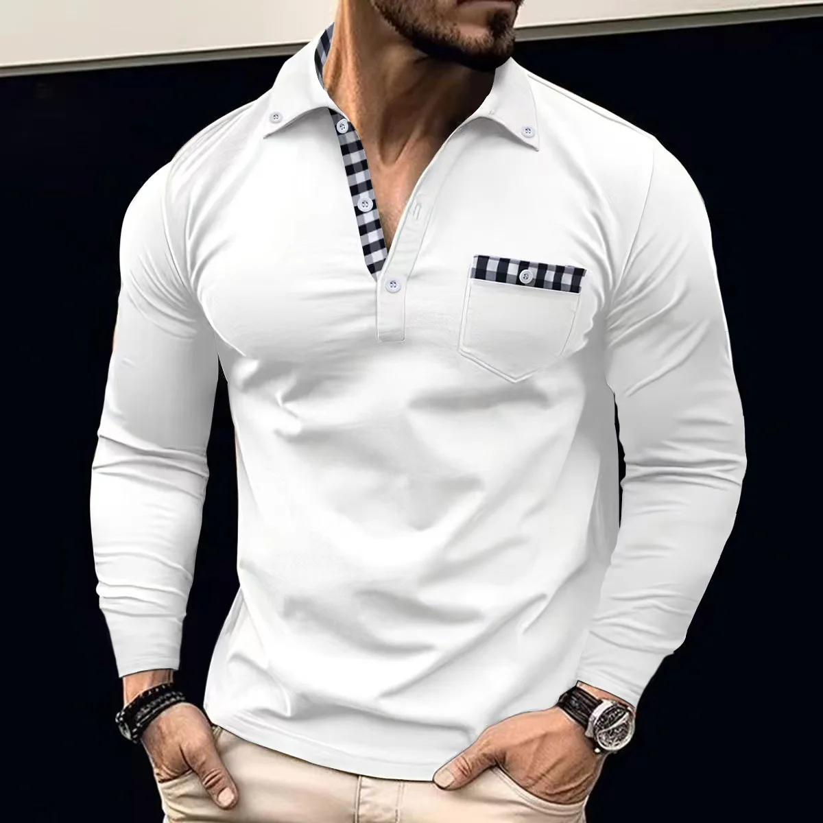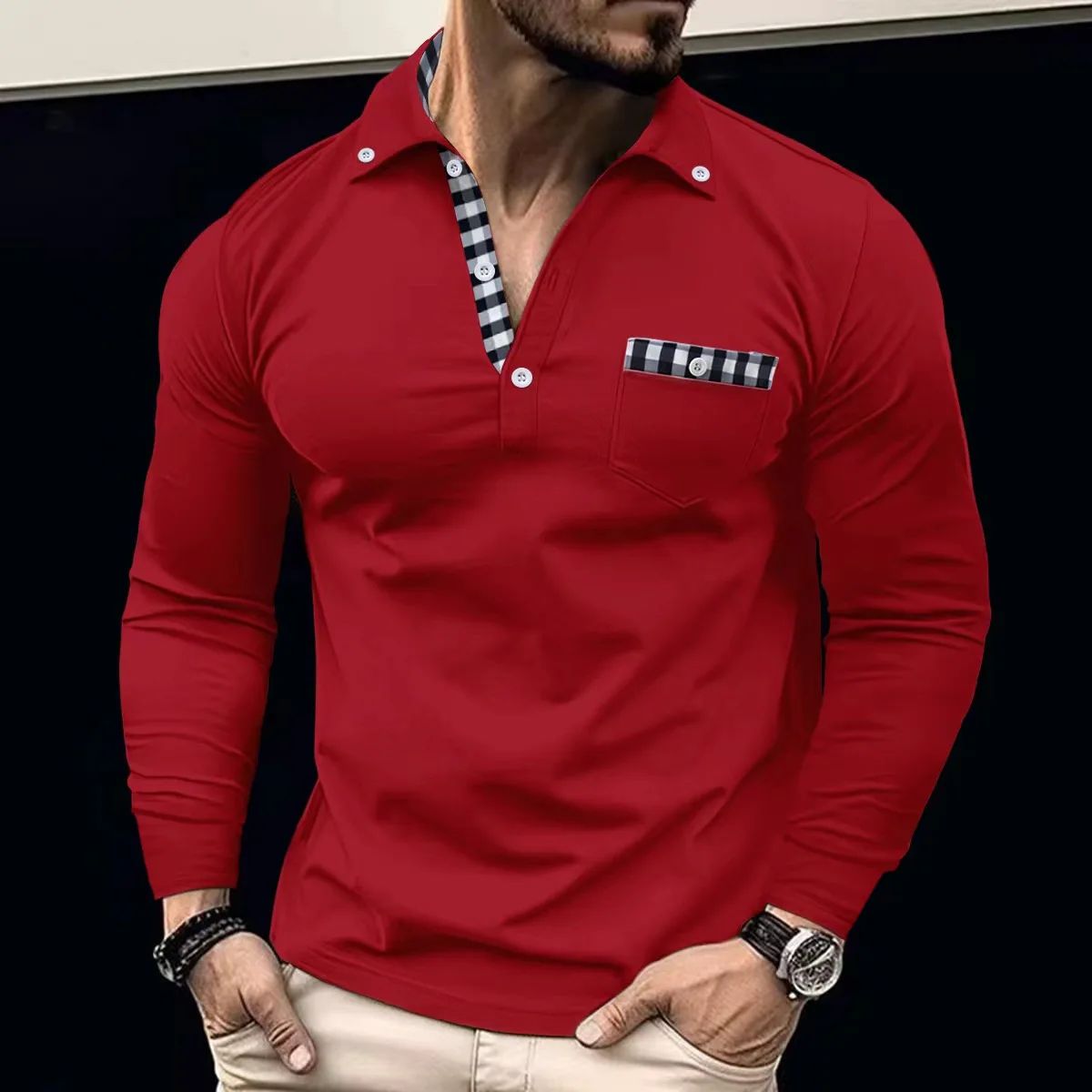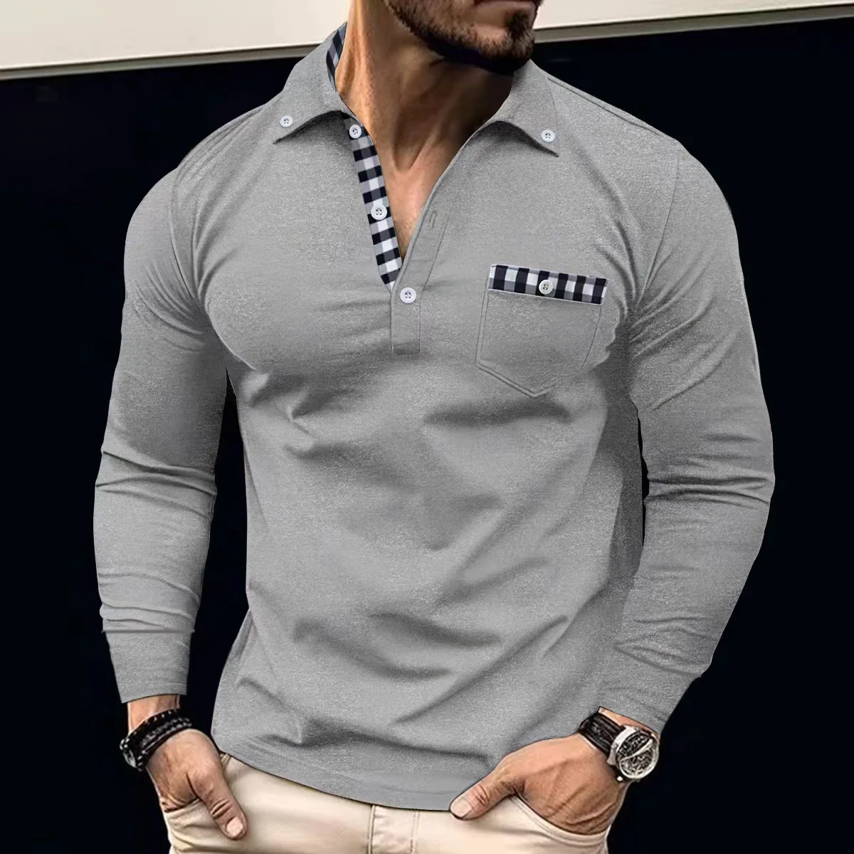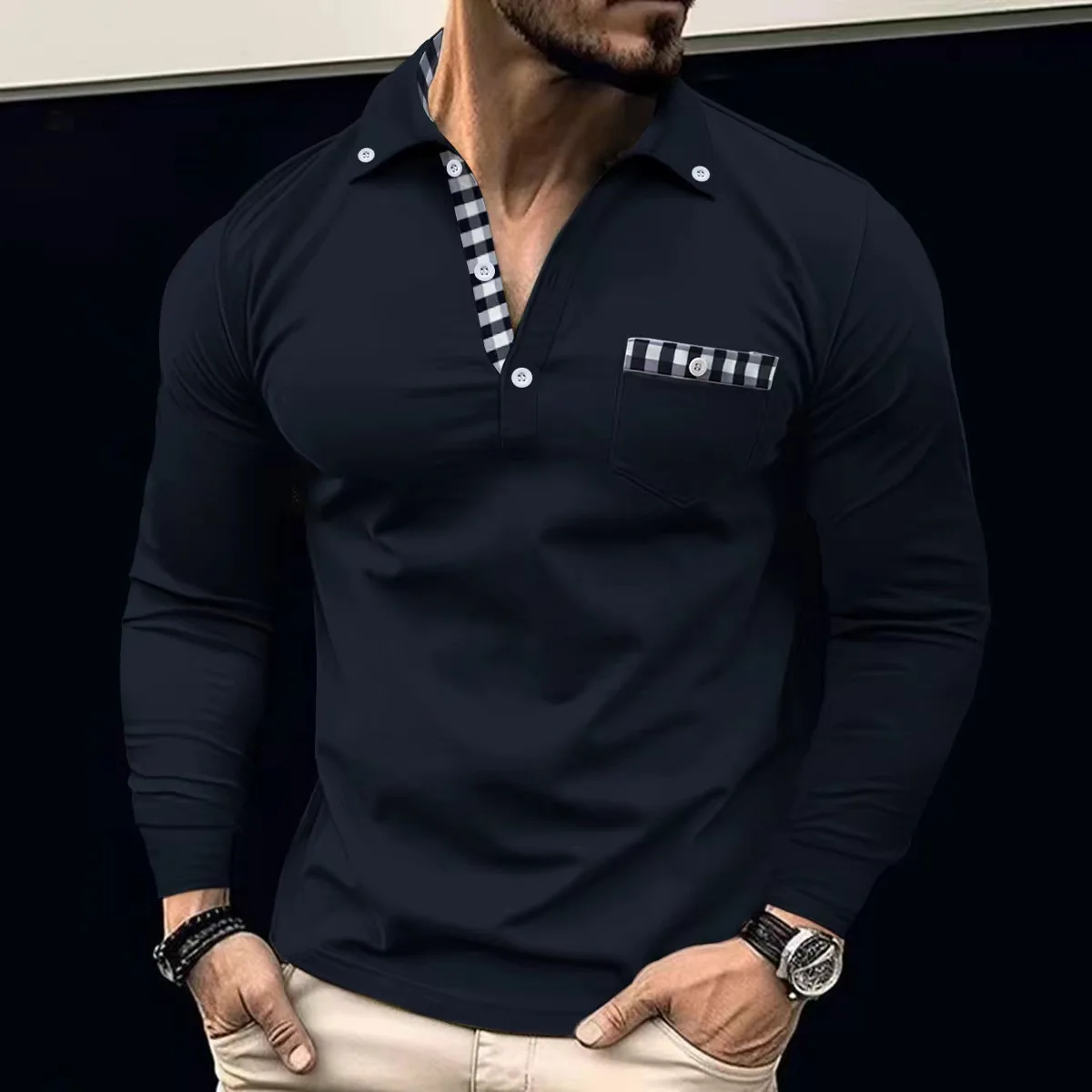 Spring And Autumn Daily Men’s Patchwork Plaid Long Sleeve Solid Color Chest Pocket Multi-Button Design Casual Fashion POLO Shirt