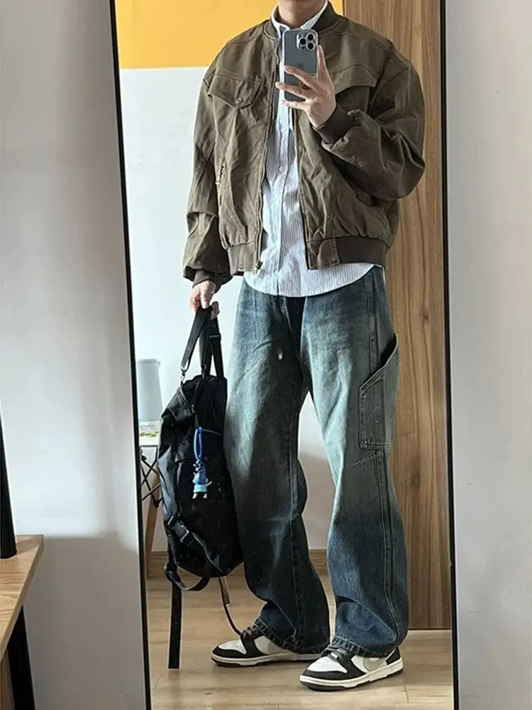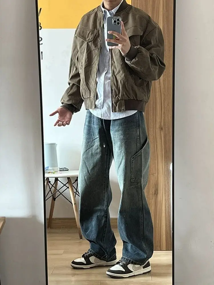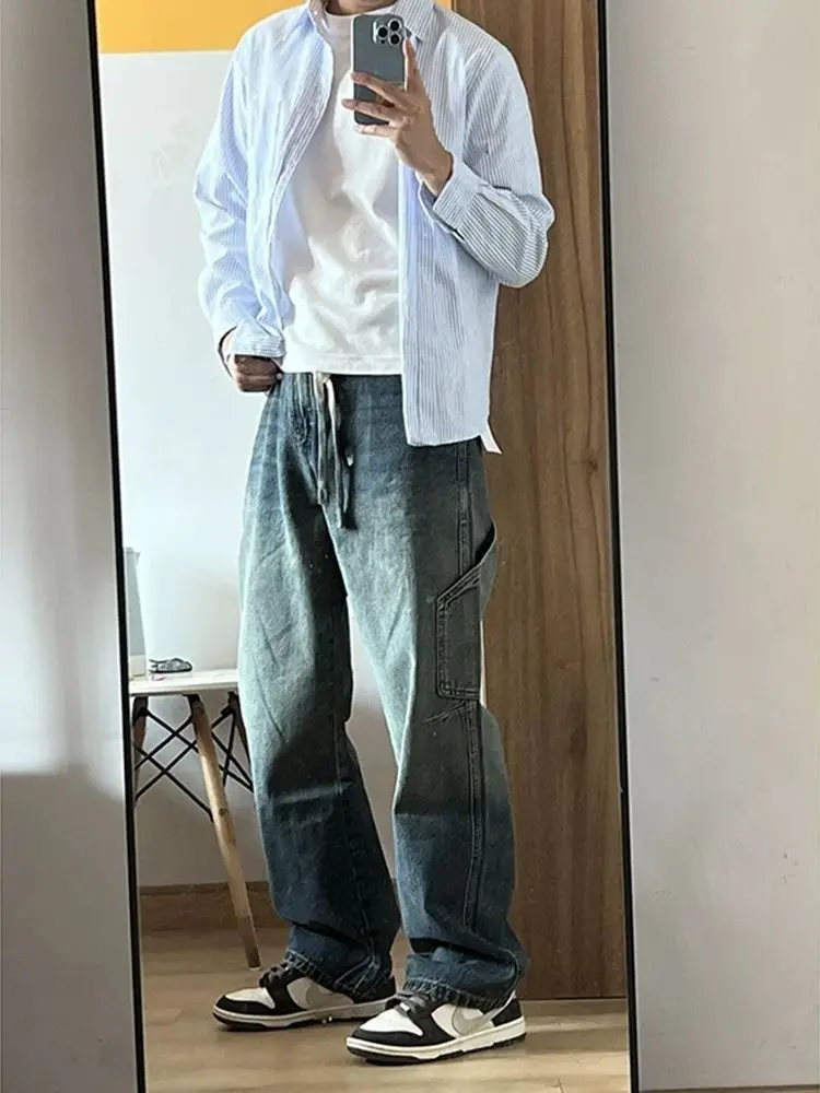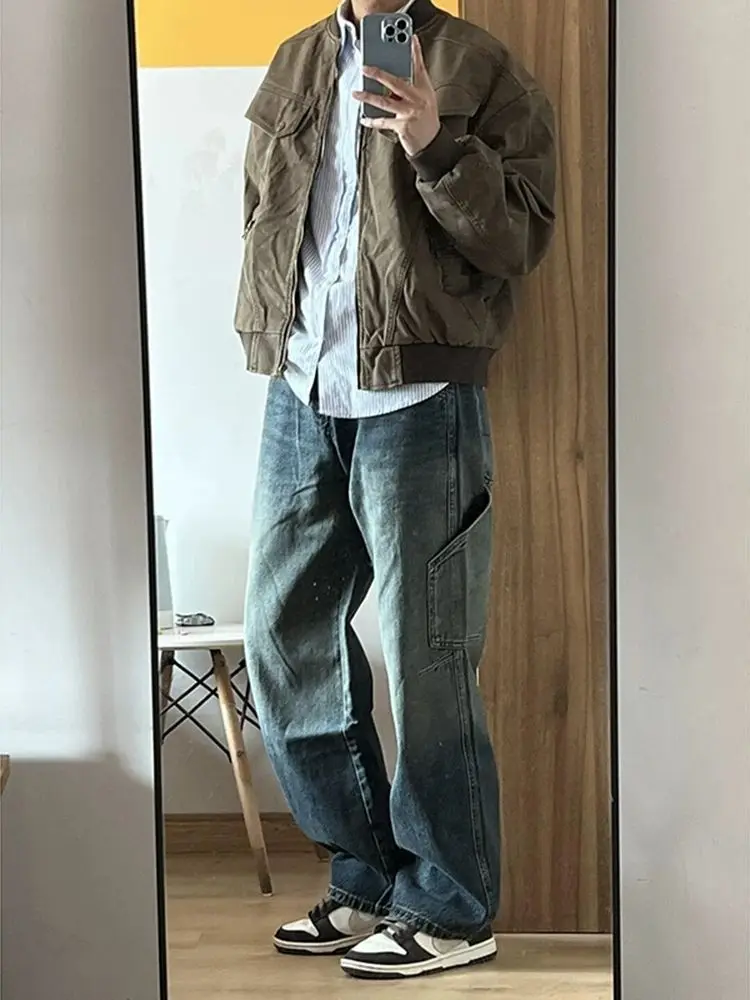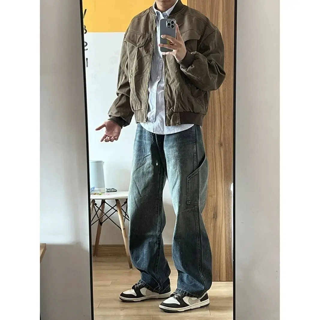 Spring and Autumn Men and Women Trendy Personalized Straight Tube Splicing Work Clothes Jeans American Couple Loose Casual Pants