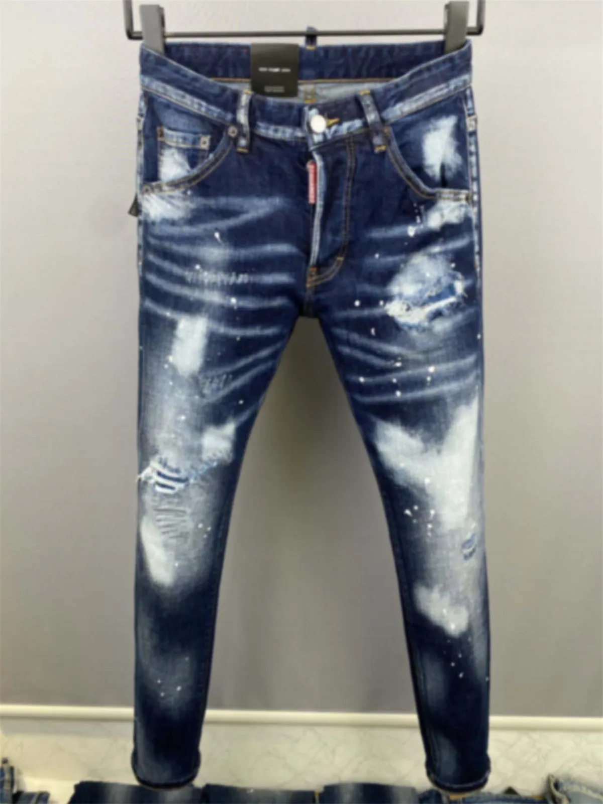 Spring and Summer 2025 New D2 Jeans Trendy Men’s Washed Grinding Hole Patch Paint Slim-fit Micro-elastic Feet Blue