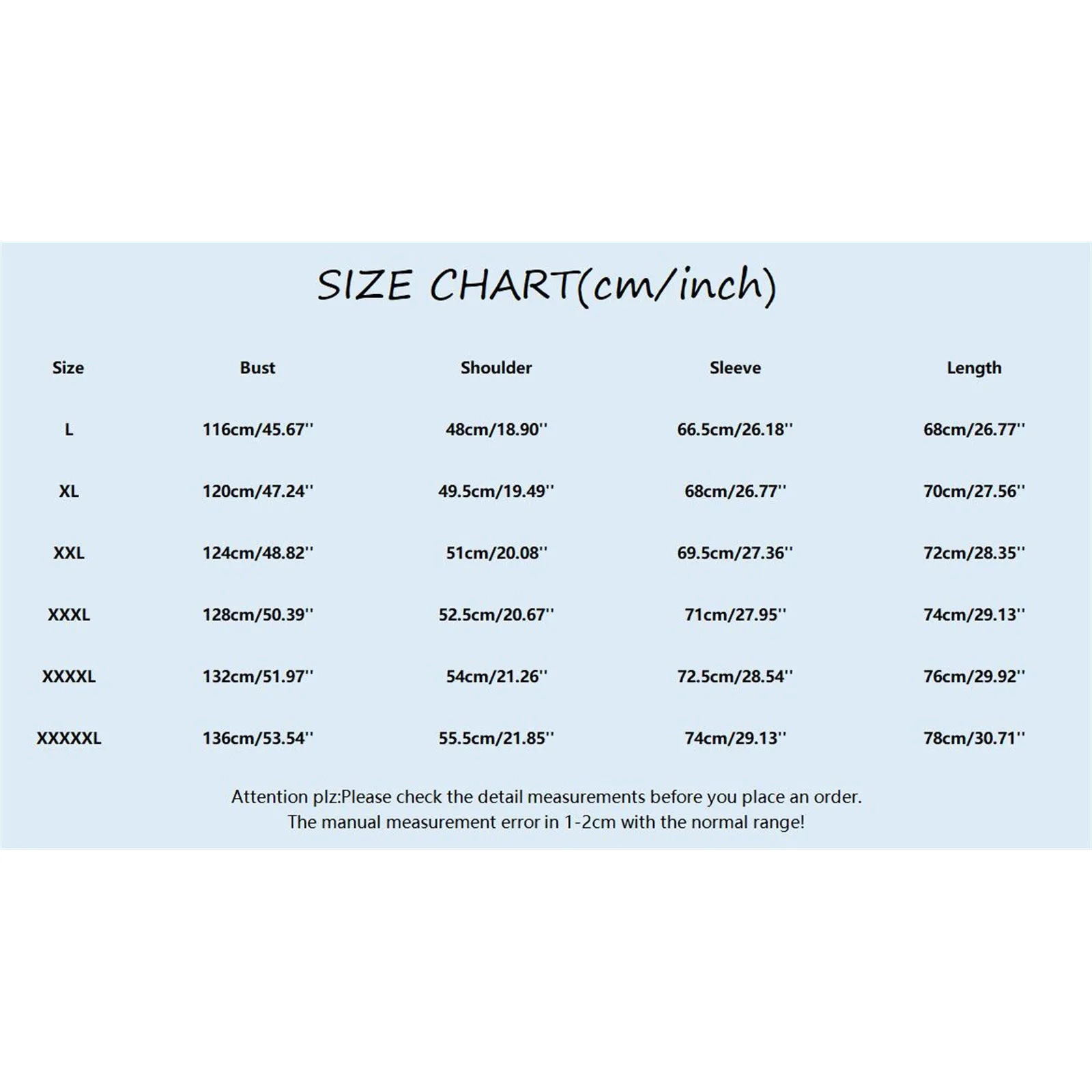 | Size:XXXXL | Bust:132cm/51.97” | Shoulder:54cm/21.26” | Sleeve:72.5cm/28.54” | Length:76cm/29.92” |