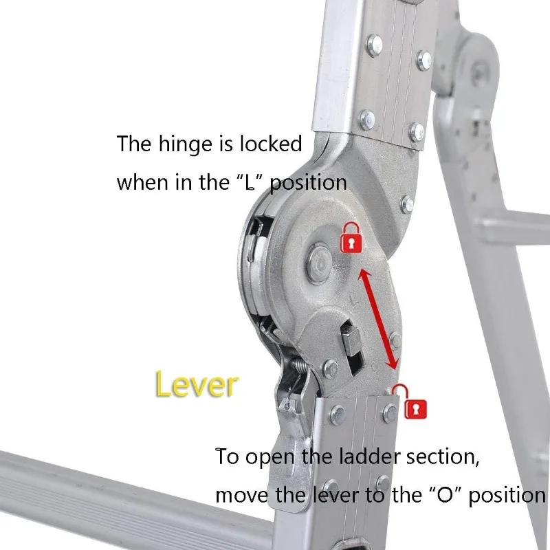 - Large Joints and Security Locks: Adopting large joints, whose load capacity and durability are three times higher than with smaller joints; connected by six security locks, which can be opened and locked for changing the shape of ladder easily while guaranteeing the security
