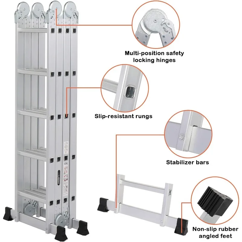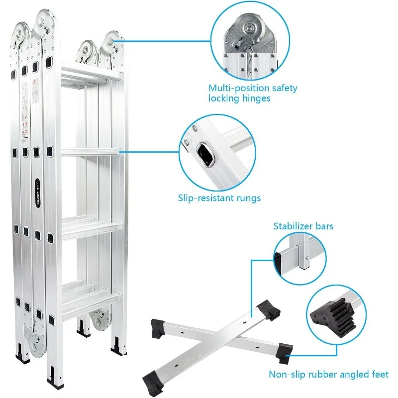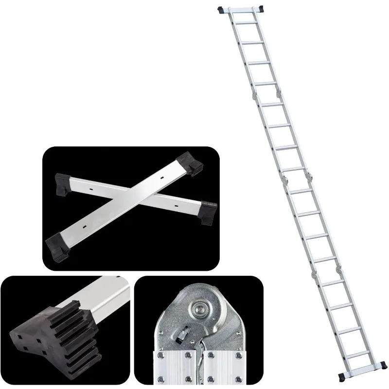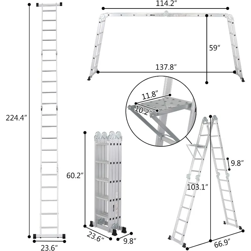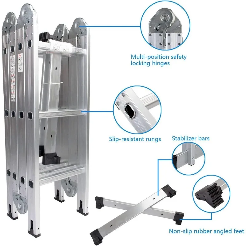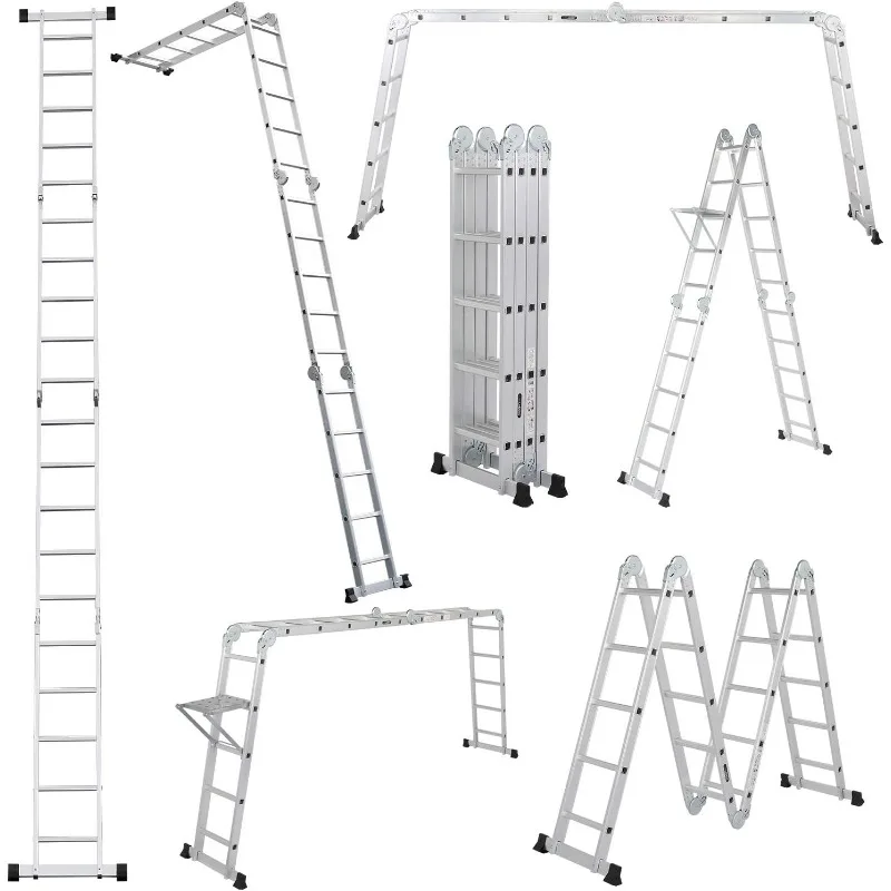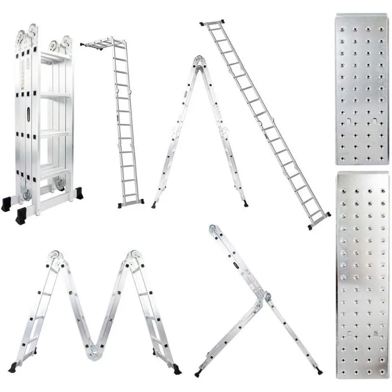 - Multi-function: This aluminium ladder can be used as scaffold, leaning ladder, stepladder and also can be changed into many different shapes to meet different height requirements and working needs. Can be used 9 different ways, use as a temporary bridge or at construction. It can be used as single ladder, double sided ladder, trestle, work platform, stair ladder, telescoping ladder, twin stepladder, stairway stepladder, or as two scaffold bases etc.