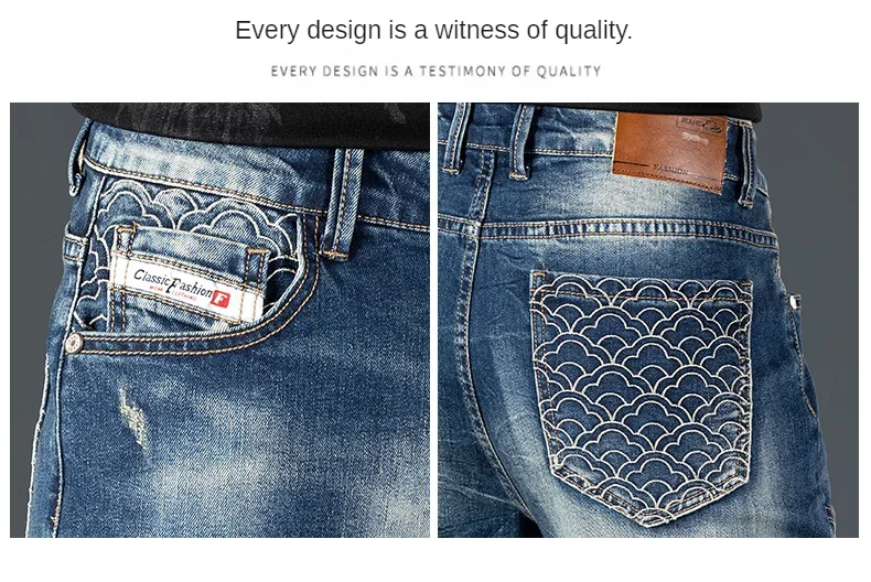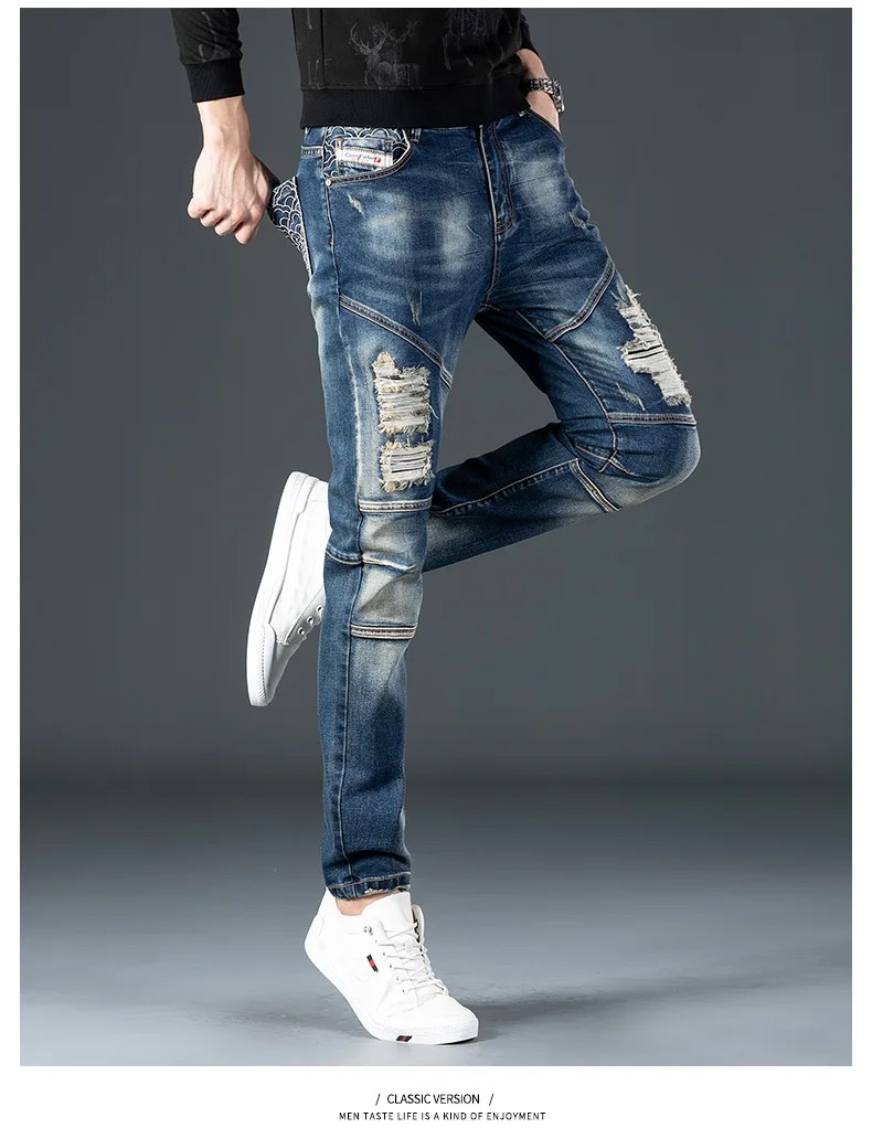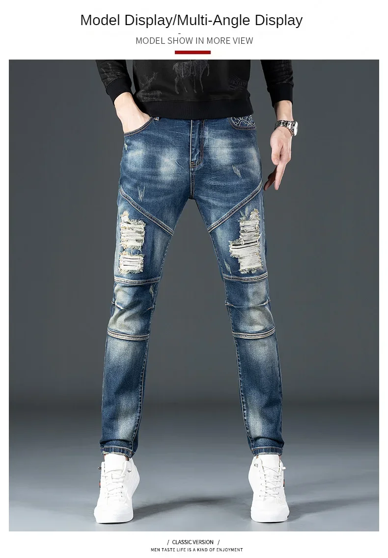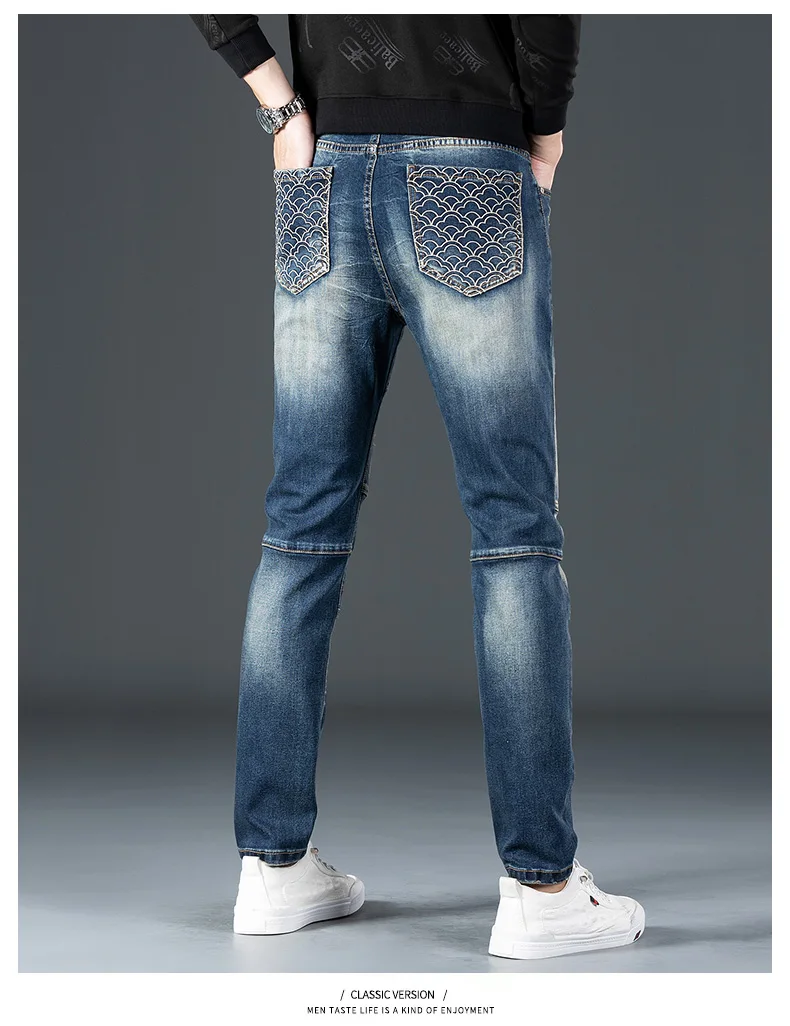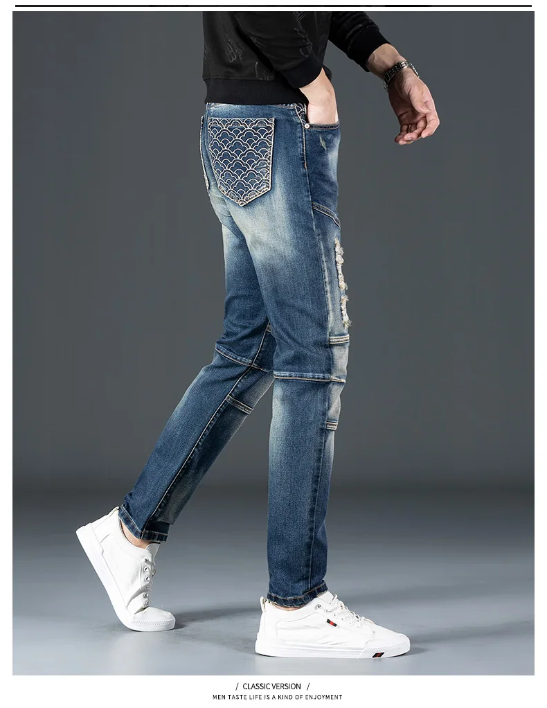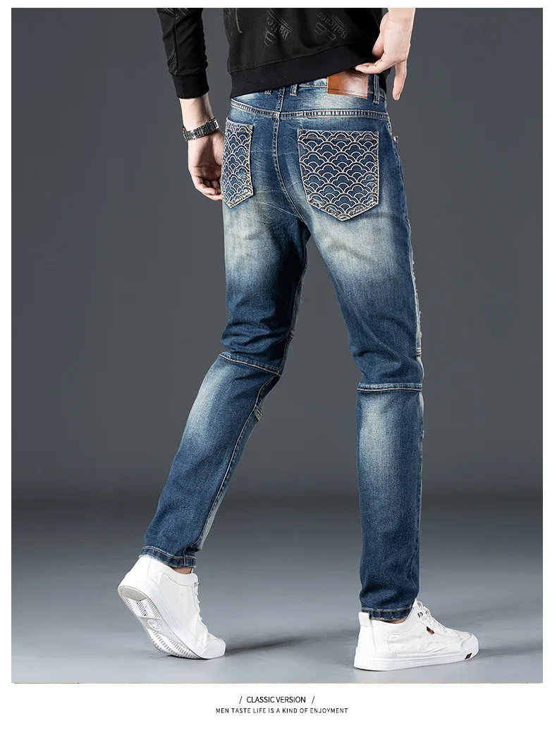 Stretch Nostalgic Denim Jeans Men’s Trendy Slim Washed Embroidered Design Ruined Hole Fashion Party Pants Large Size