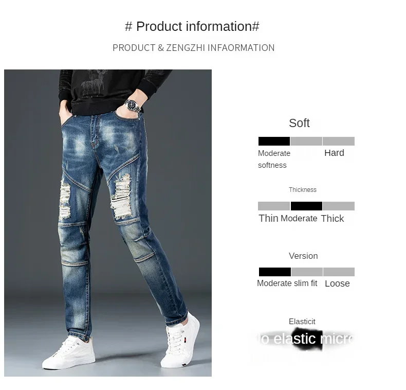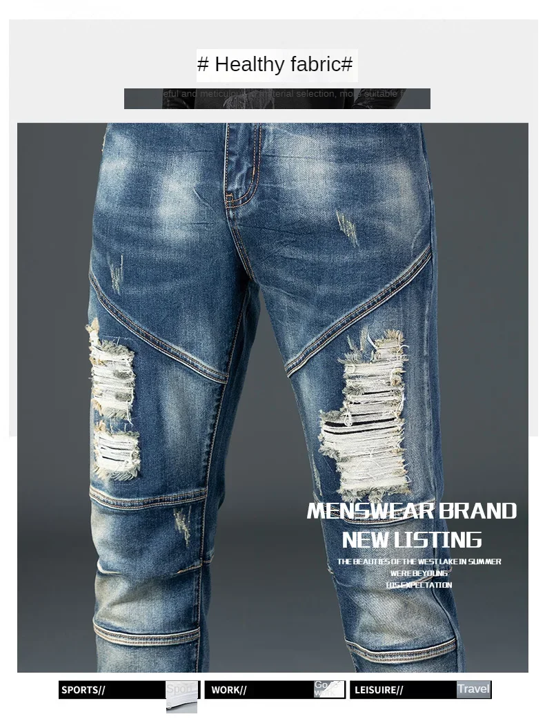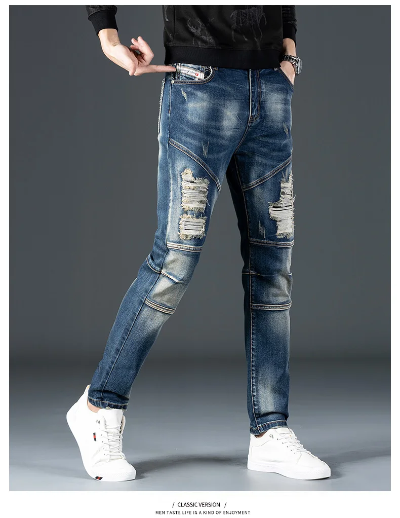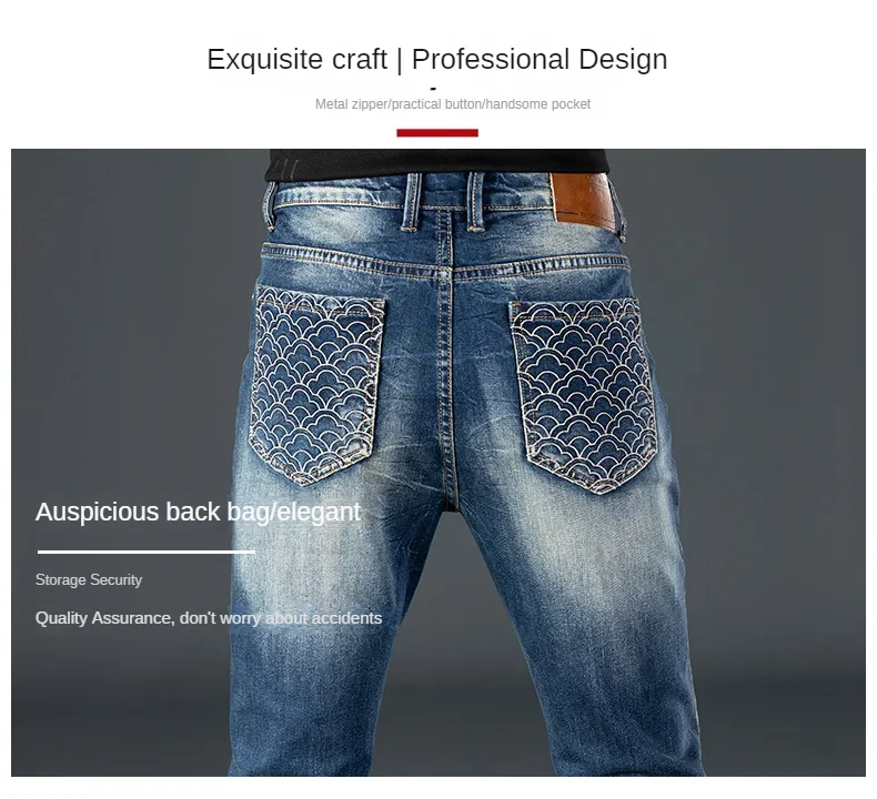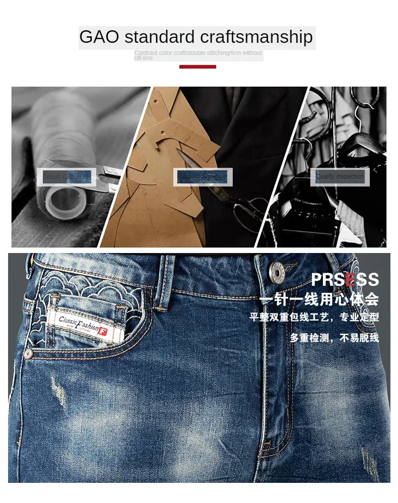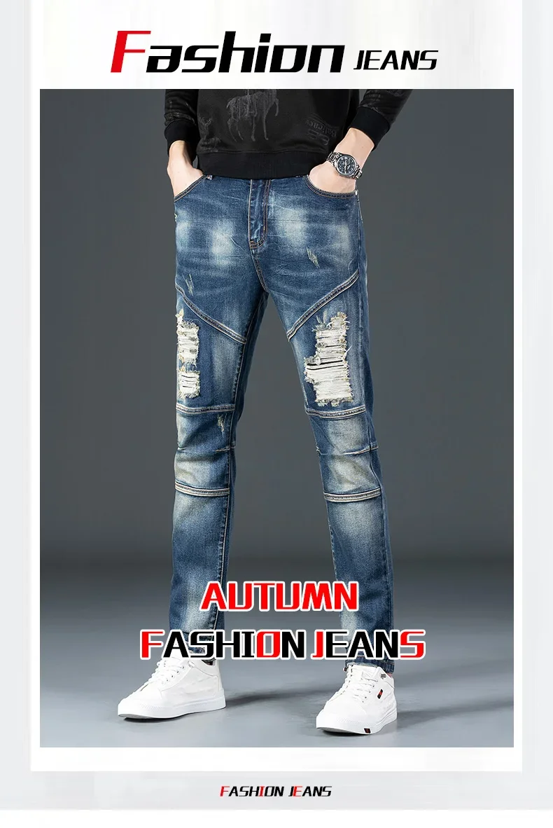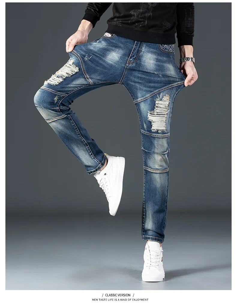 Stretch Nostalgic Denim Jeans Men’s Trendy Slim Washed Embroidered Design Ruined Hole Fashion Party Pants Large Size