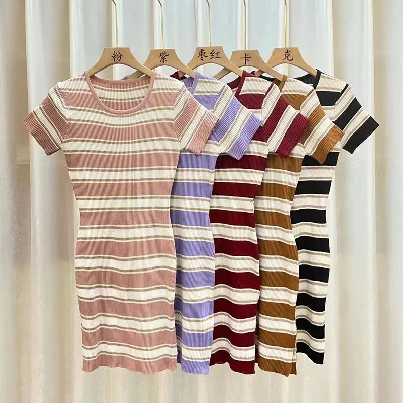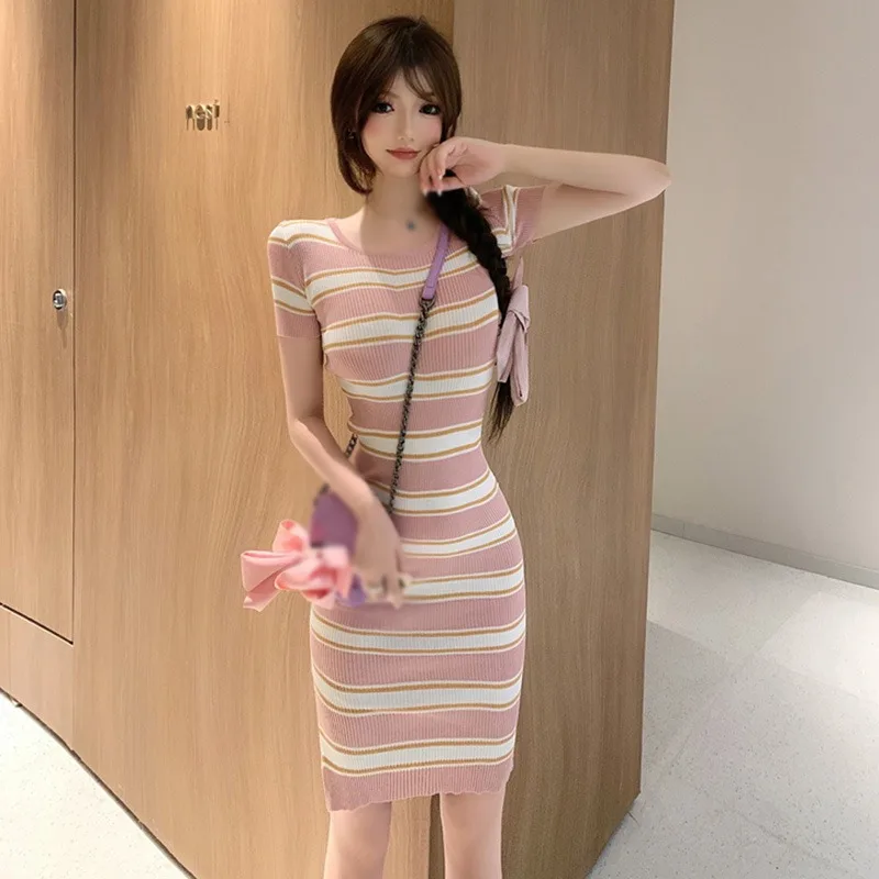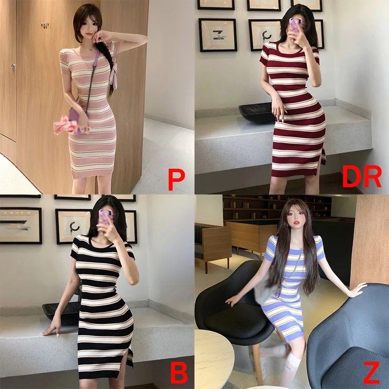 Summer Elegant Temperament Stripe Wrapped Hip Skirt Sexy Slim Fit Breathable Split Dress Women’s Minimalist Dress