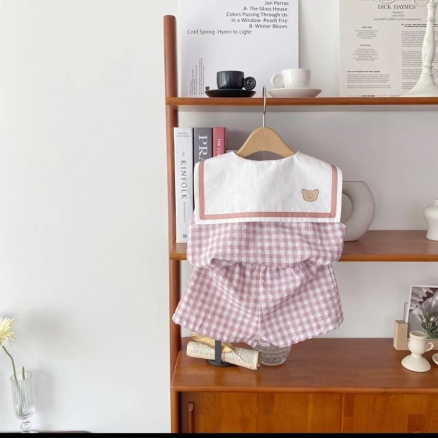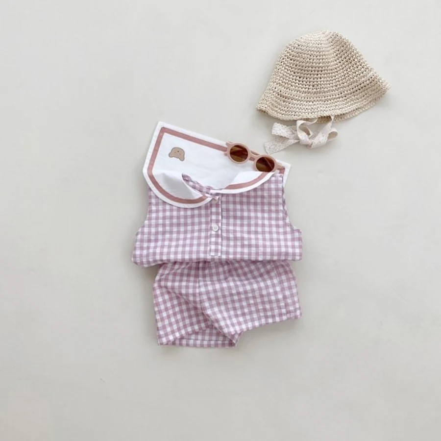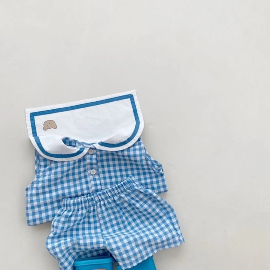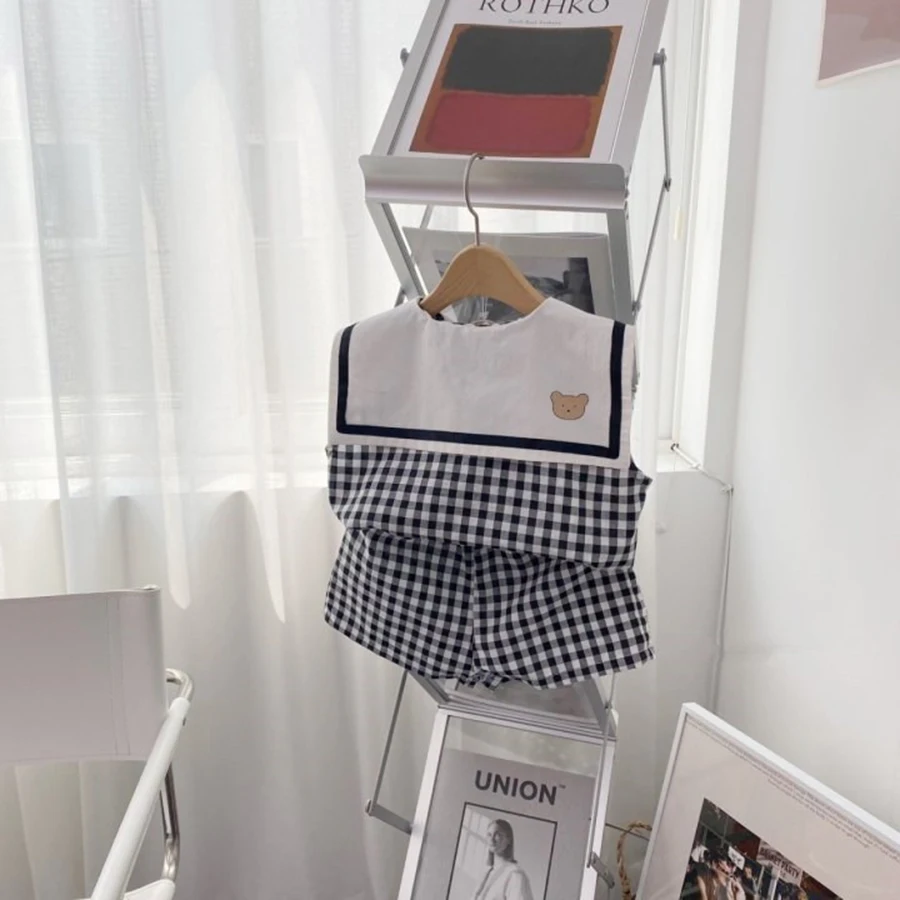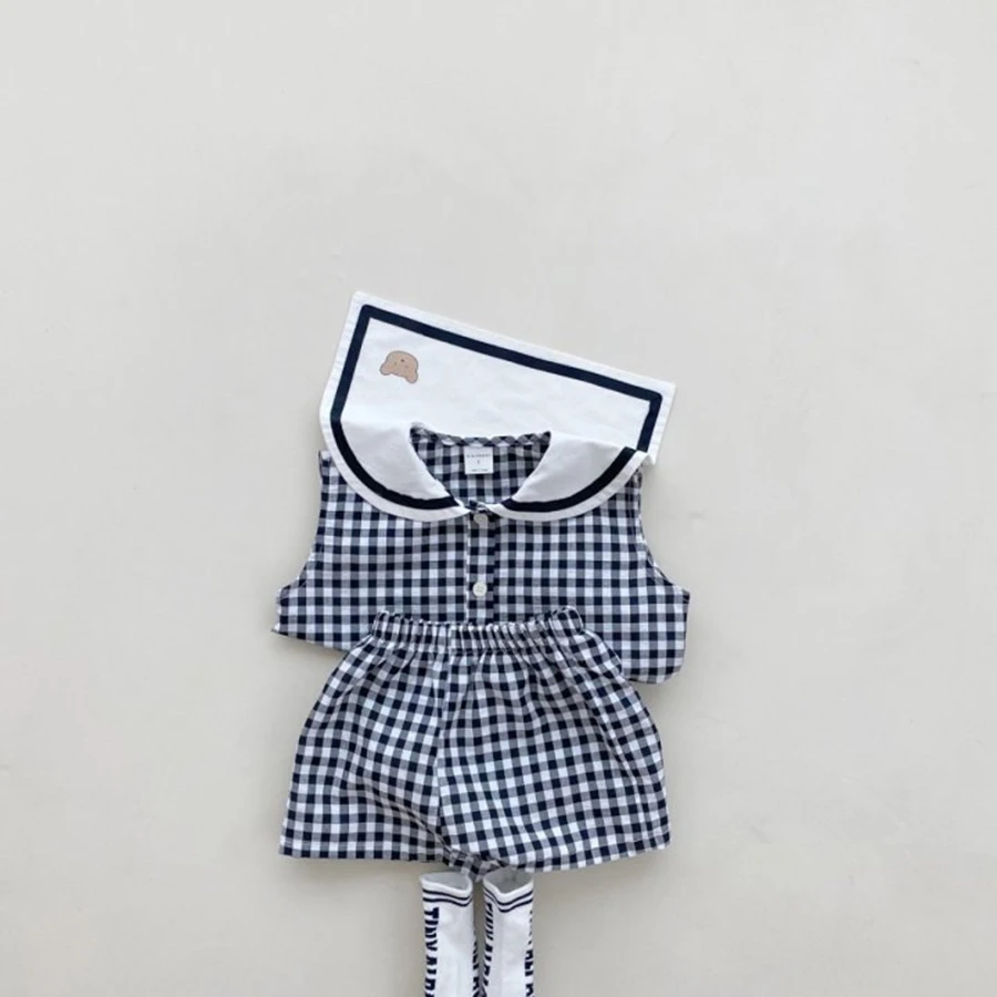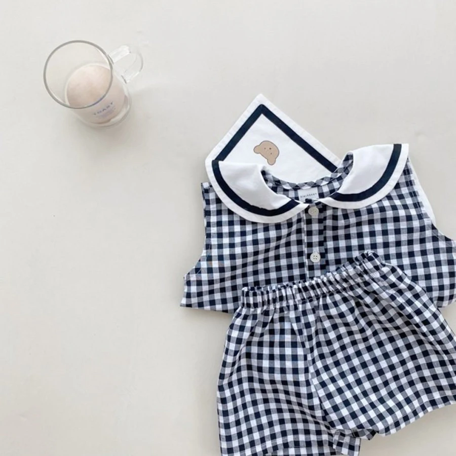 Summer Newborn Baby Boy Girls Cell Sleeveless Cartoon Bear Navy Collar Waistcoat + Shorts Fallow Set Kids Fashion Baby Clothing