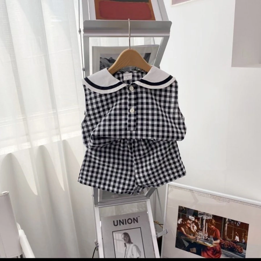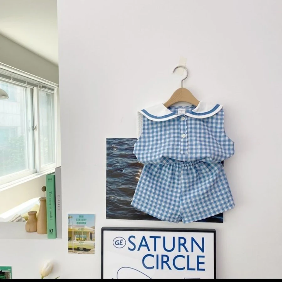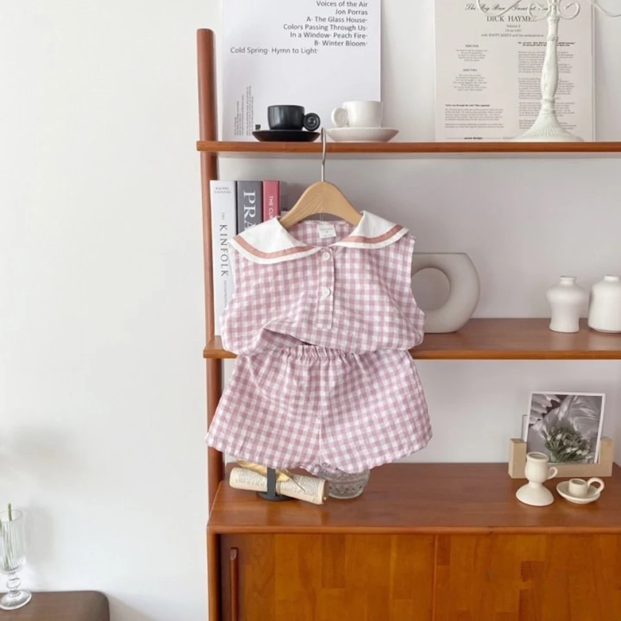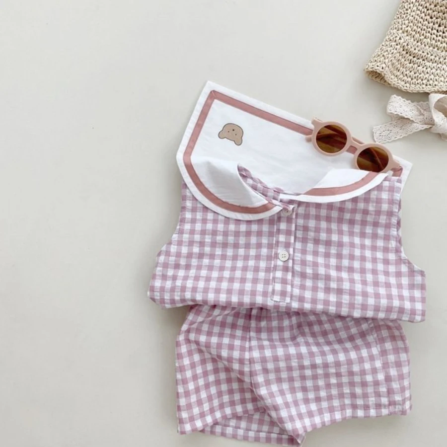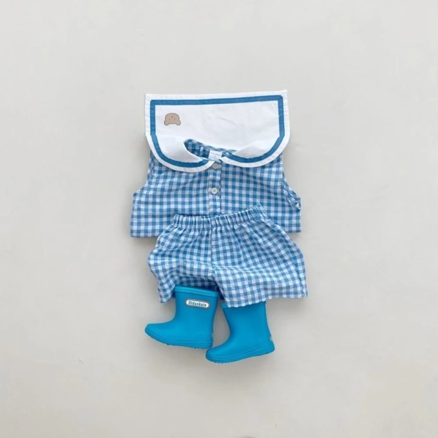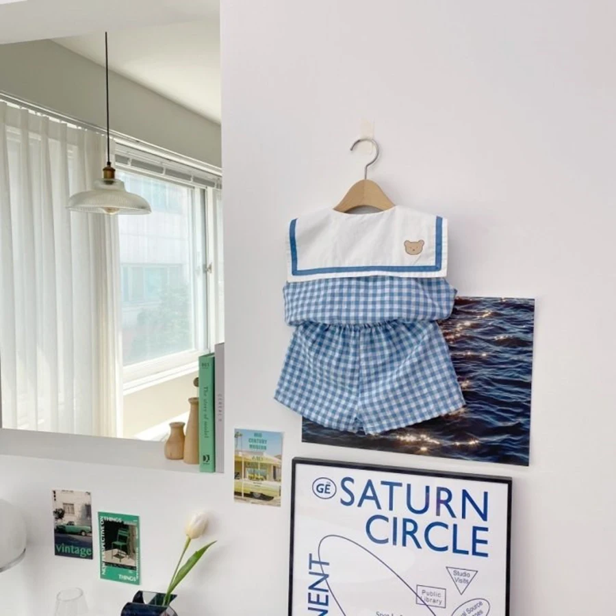 Summer Newborn Baby Boy Girls Cell Sleeveless Cartoon Bear Navy Collar Waistcoat + Shorts Fallow Set Kids Fashion Baby Clothing