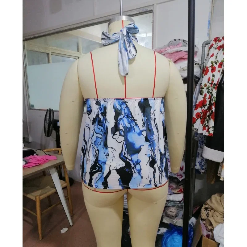 Summer Plus Size Women’s Fresh and Fashionable Ink Delicate Print Casual Micro Elastic Sleeveless Backless Cross Strap Camisole