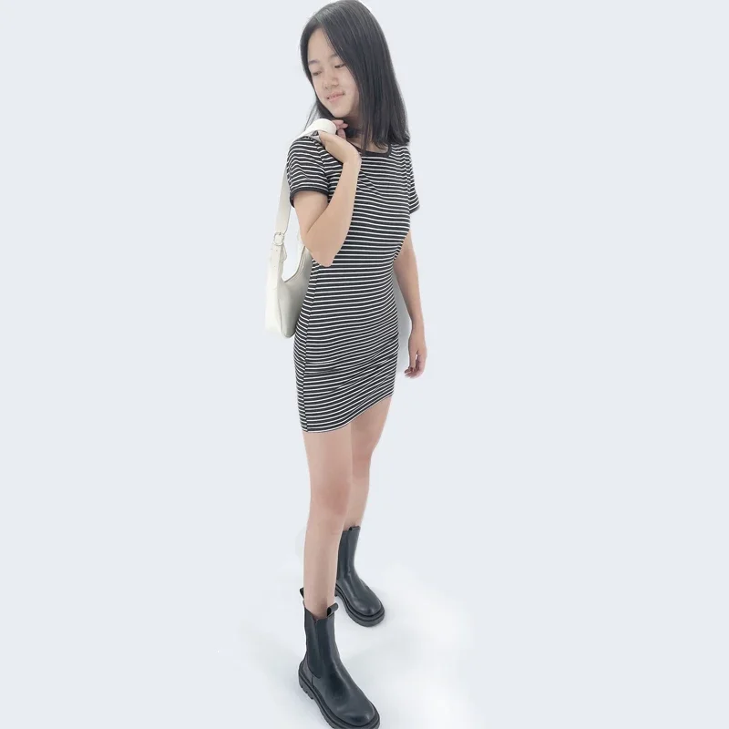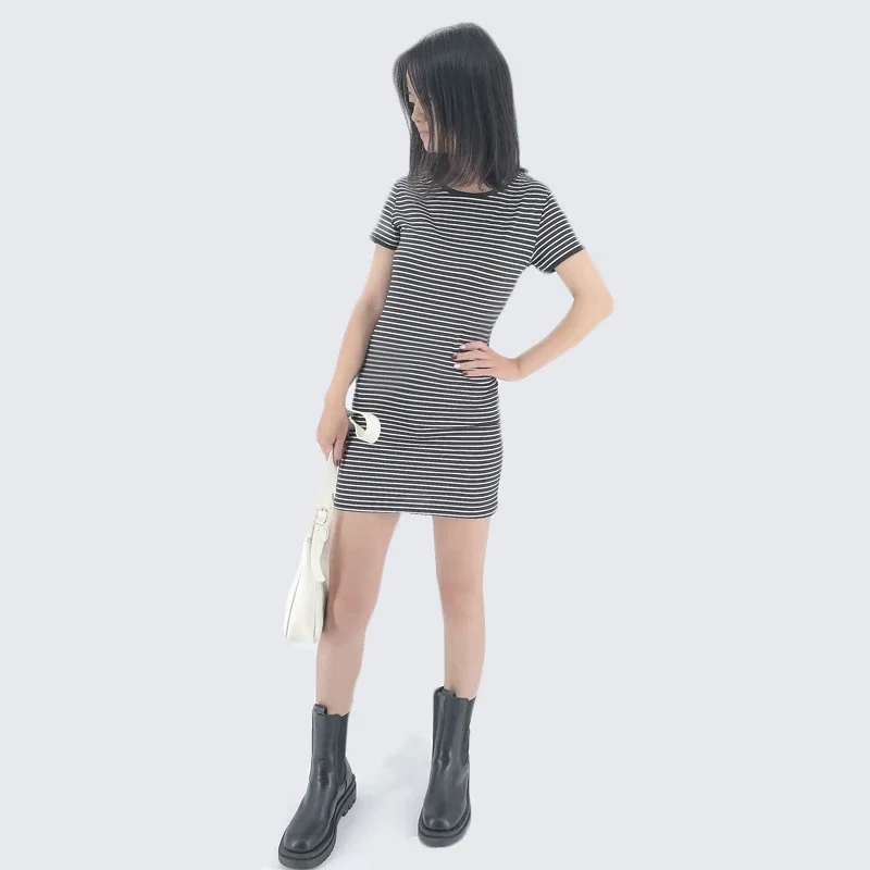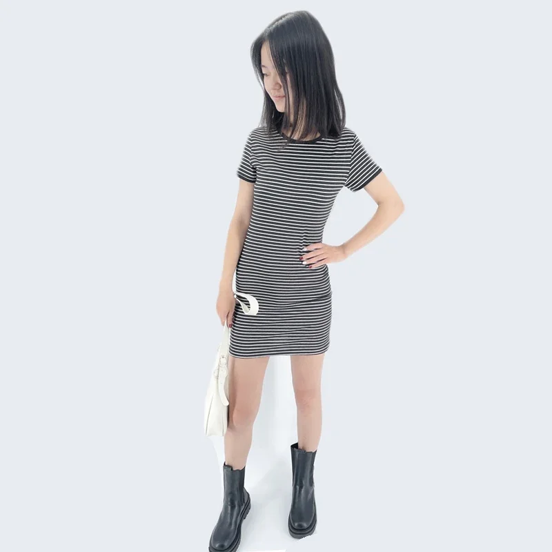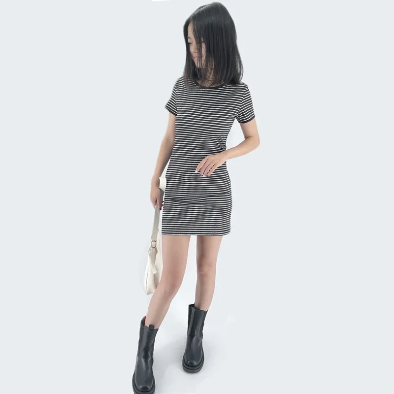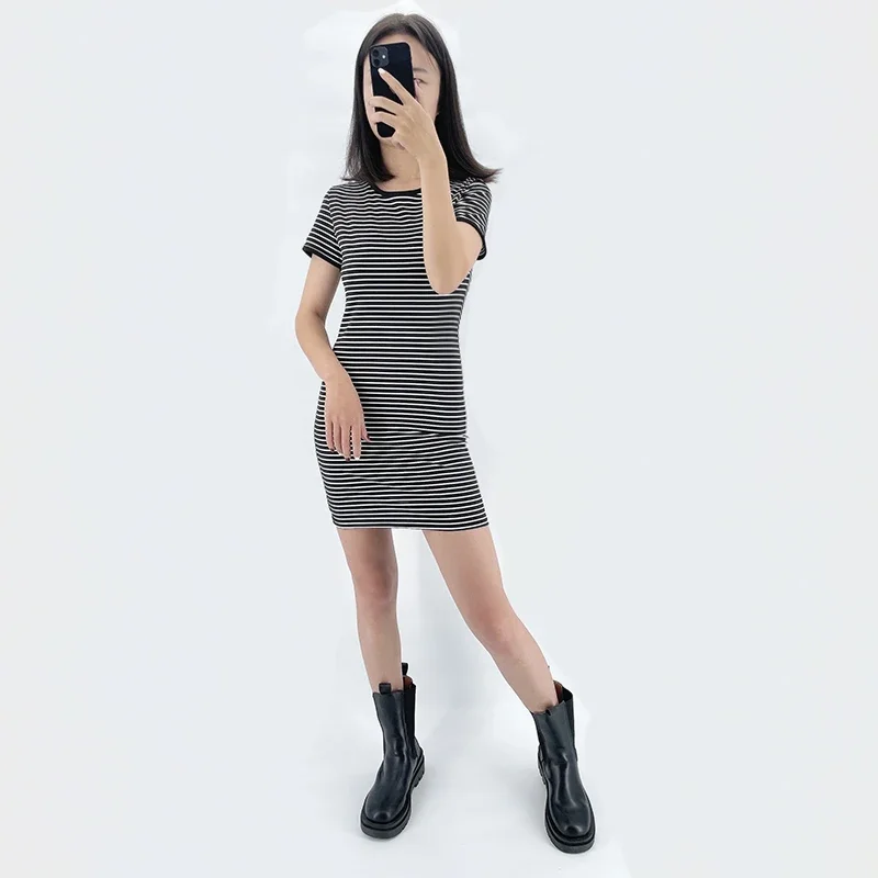 Summer Round Neck Enough Stock Short-sleeved Dress Black And White Striped Dresses Casual Elegant Sheath Slim Dress