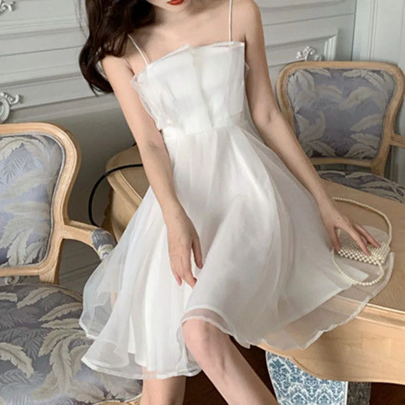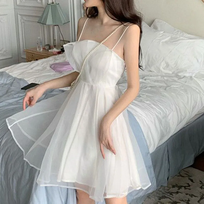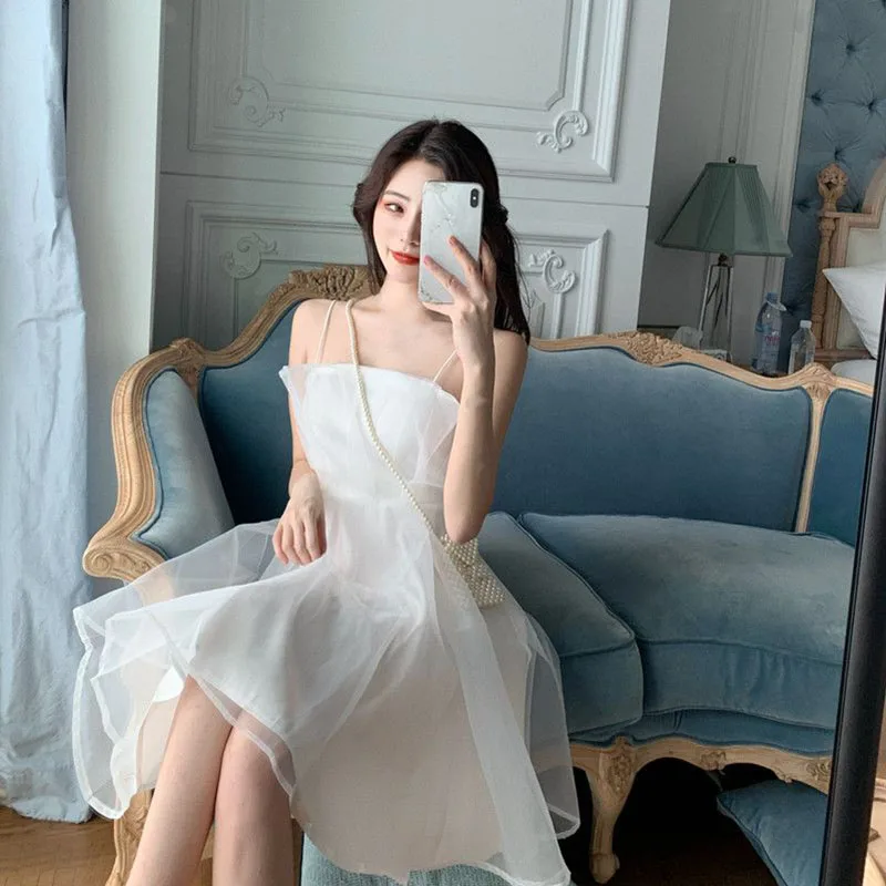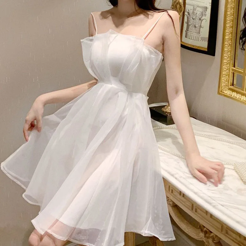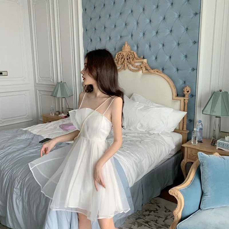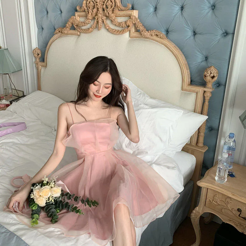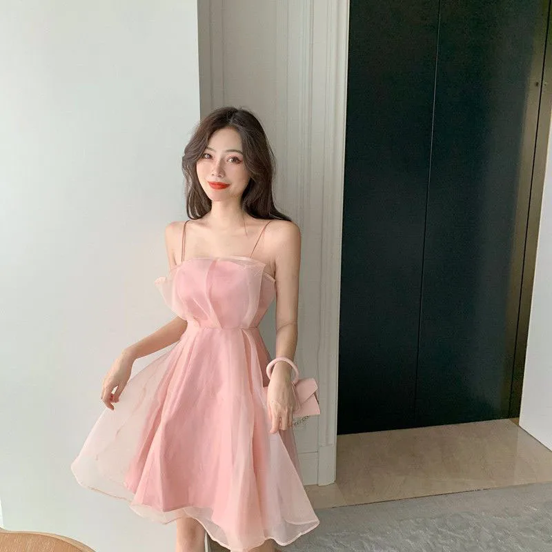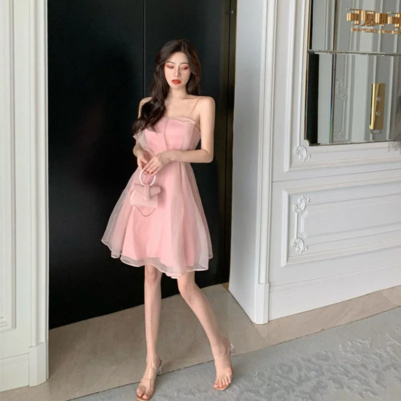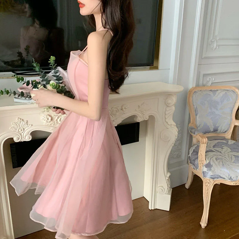 Summer sexy tulle halter dress female French slim thin shoulder strap pink dress female fashion Joker back zipper A-line skirt