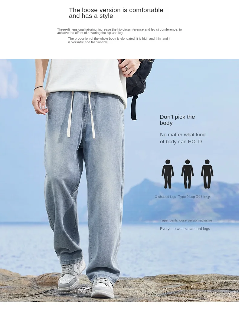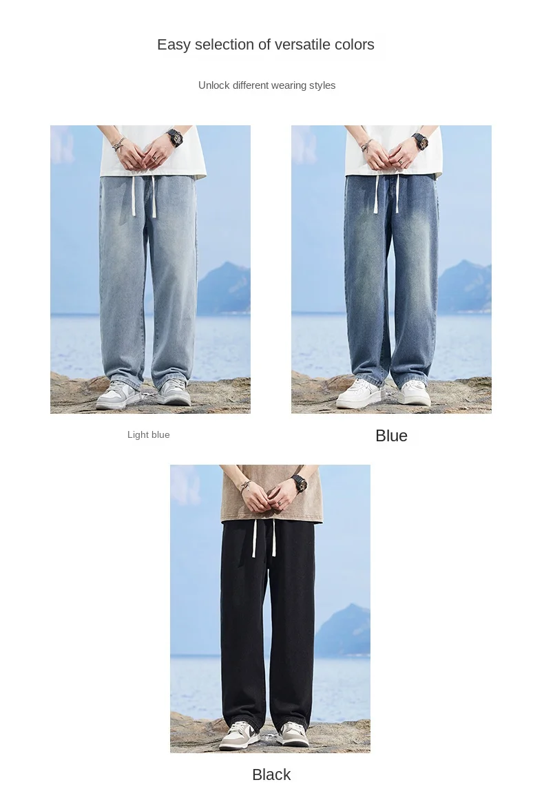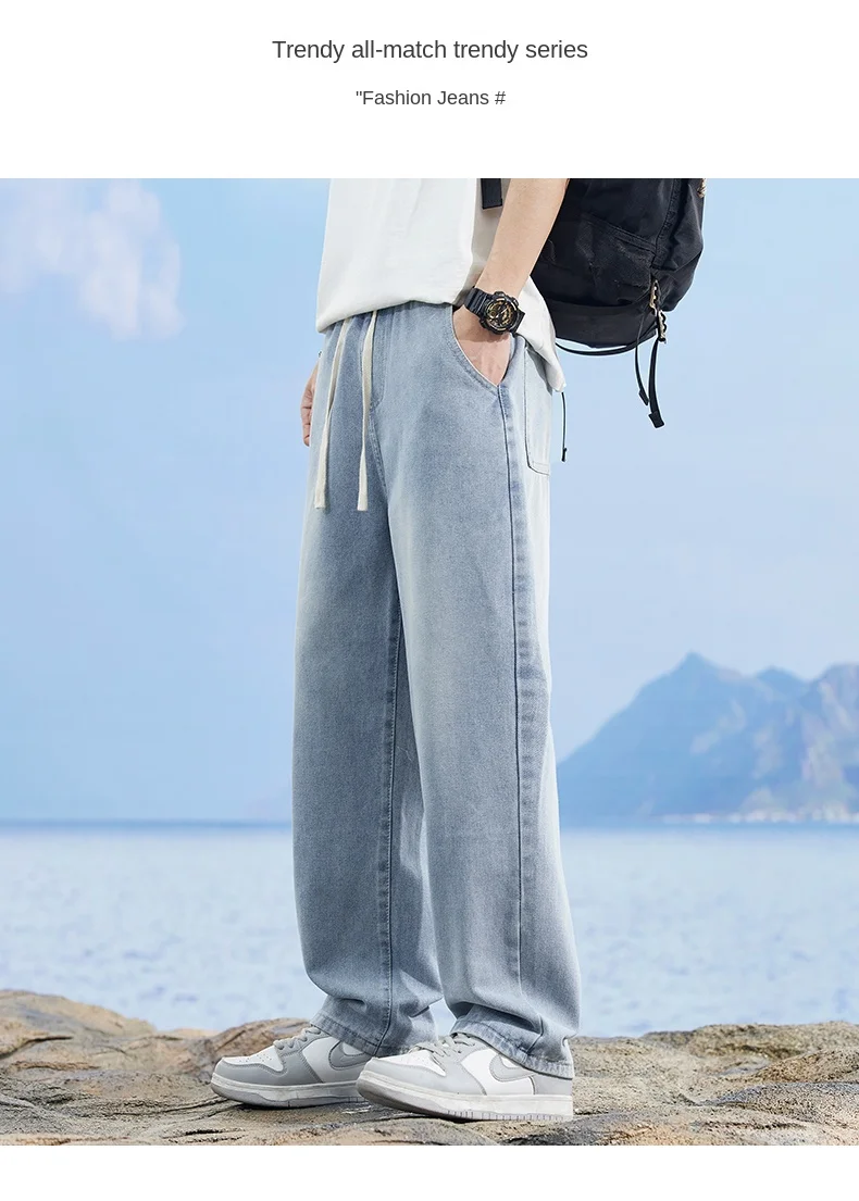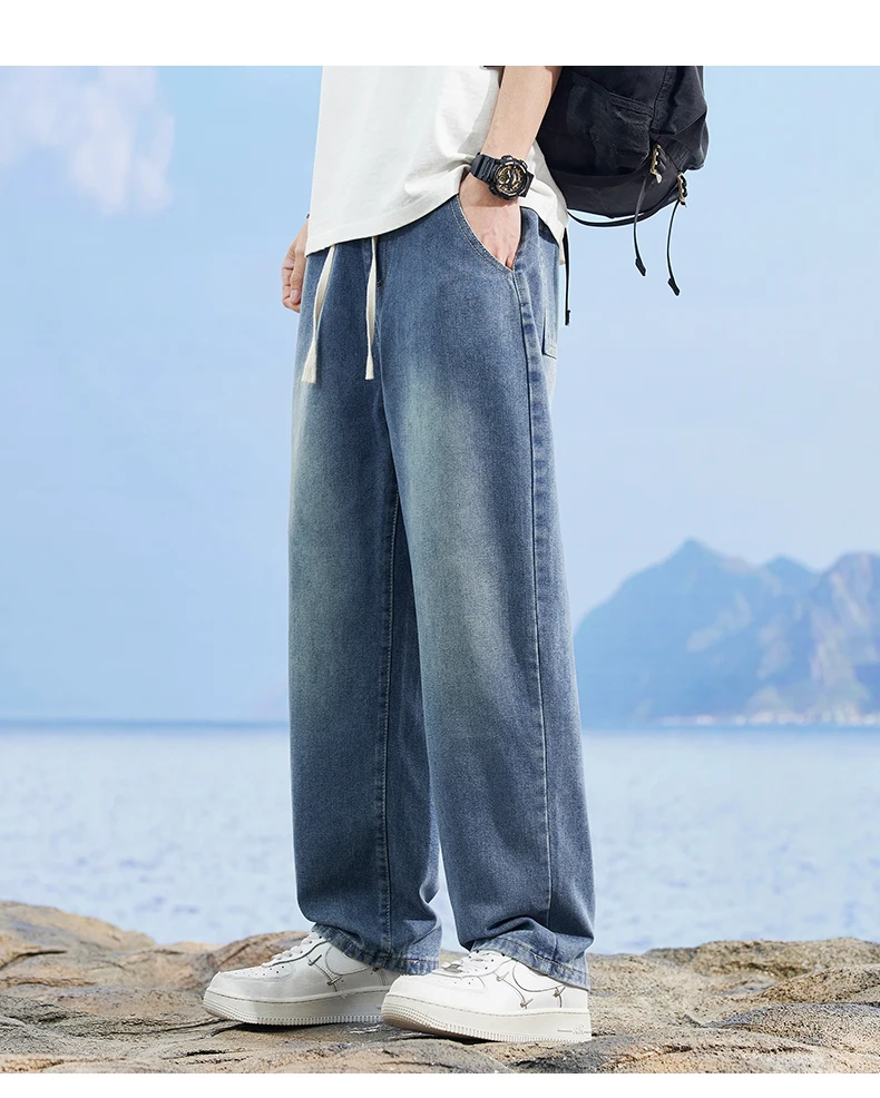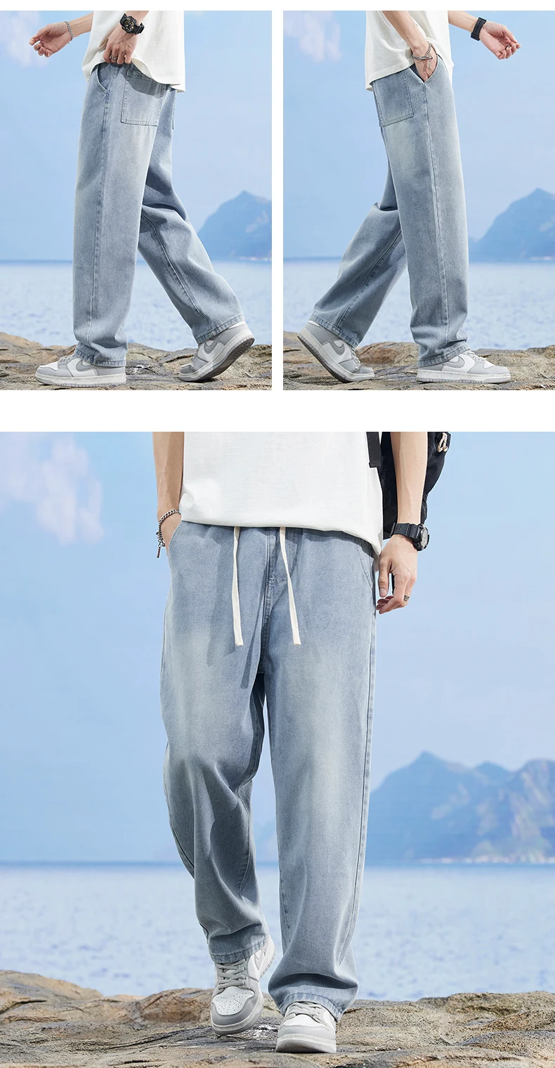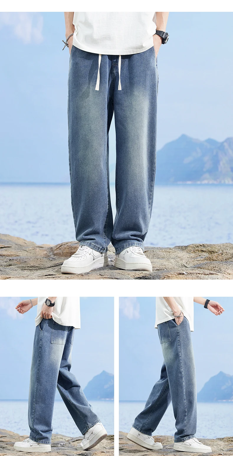 Summer Thin Jeans Men’s Elastic Waist Brand Loose Wide Legs Retro Washed Old Straight Student Trousers