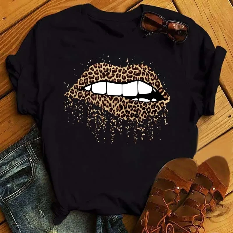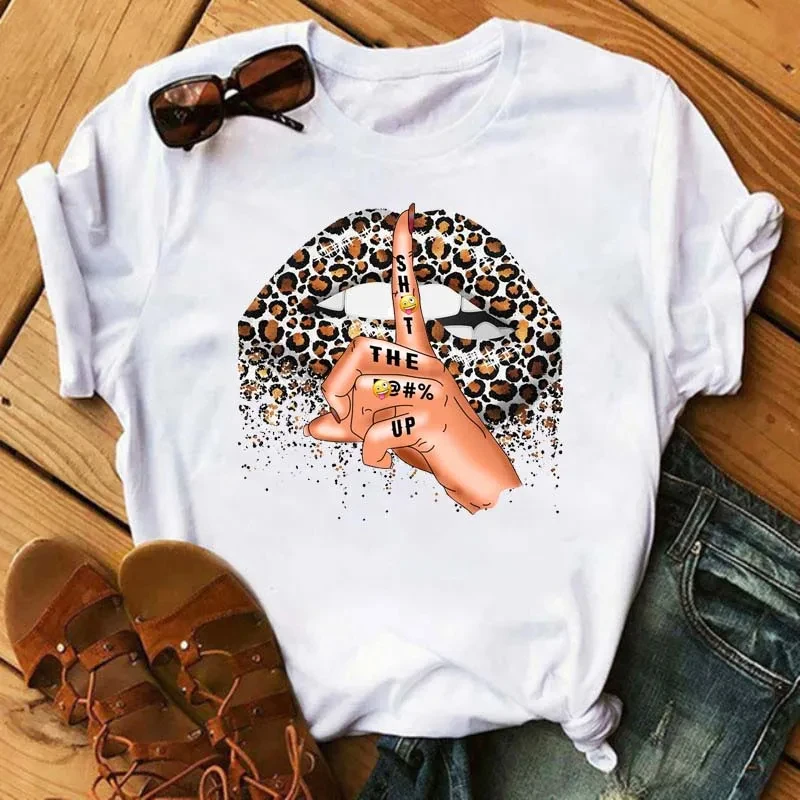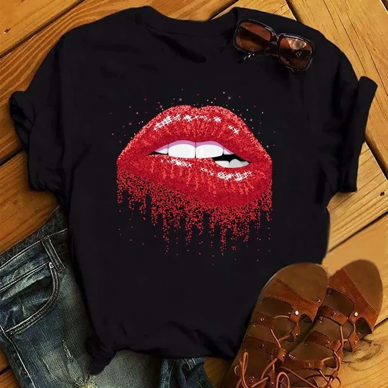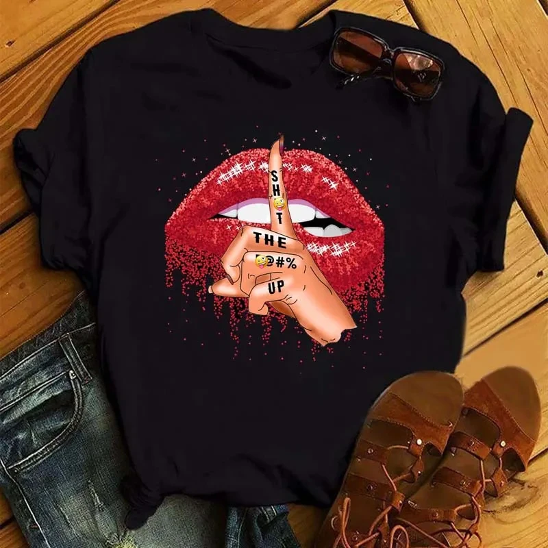 Summer Women’s Short Sleeve T-shirt Finger Red Lips Printed Plus Size Shirt Fashion Casual Cartoon Sexy Women’s Top T-shirt