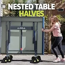 The two halves of the JOOLA Nova Pro Plus Table sit on separate 4-wheel trolley systems, making transport and storage easy. The table can be used in playback position for solo practice or can be used as completely separate multi-functional tables.