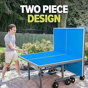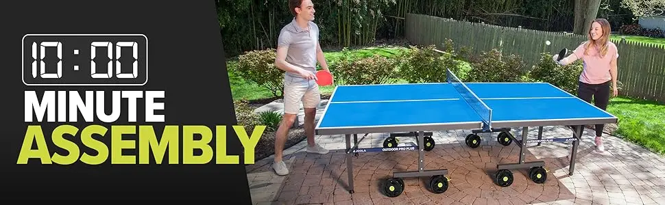 The JOOLA Outdoor Table Tennis Table is a high-quality table tennis table that can be used inside or outside, designed specifically to withstand outdoor use all year round, in all weather conditions and terrains. Featuring a 6mm aluminum plastic composite surface, resistant to warping and chipping. The JOOLA Outdoor Table offers a consistent bounce even after years of extended outdoor play, making this a great family investment. No maintenance is required since each half is mounted on a 30mm x 30mm rust-resistant, powder-coated steel undercarriage. Adjustable height levelers on each leg help balance the table on uneven ground. Double anti-tilting devices and durable 3-inch locking casters make it safe and easy to transport. Enjoy playing with friends or training solo by folding up one half of the table in the playback position. The JOOLA Outdoor comes with an easy-to-install weatherproof net set with adjustable posts to ensure a level playing surface and is the perfect addition to your deck, backyard, or community playground. Start playing like a champion with equipment developed for champions.