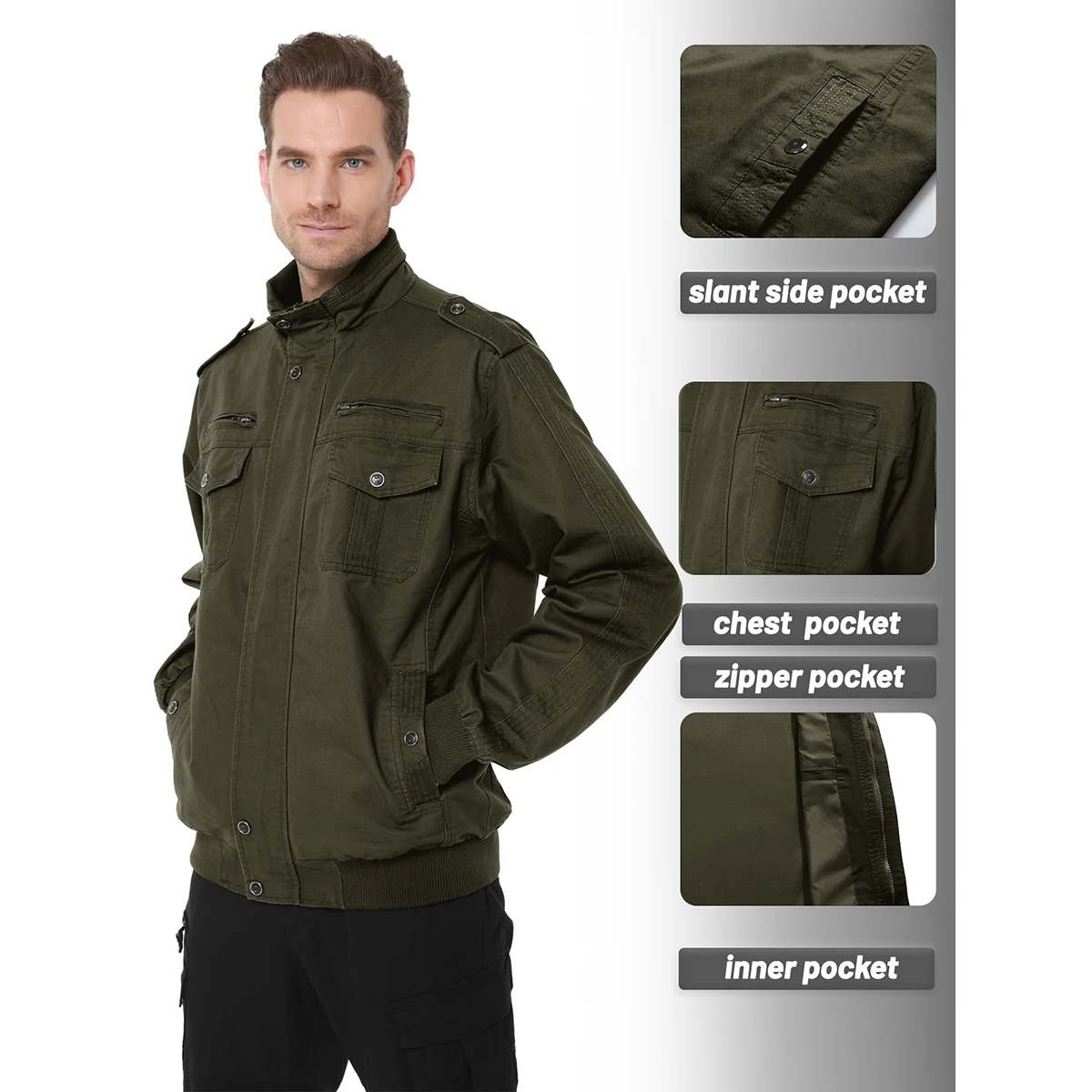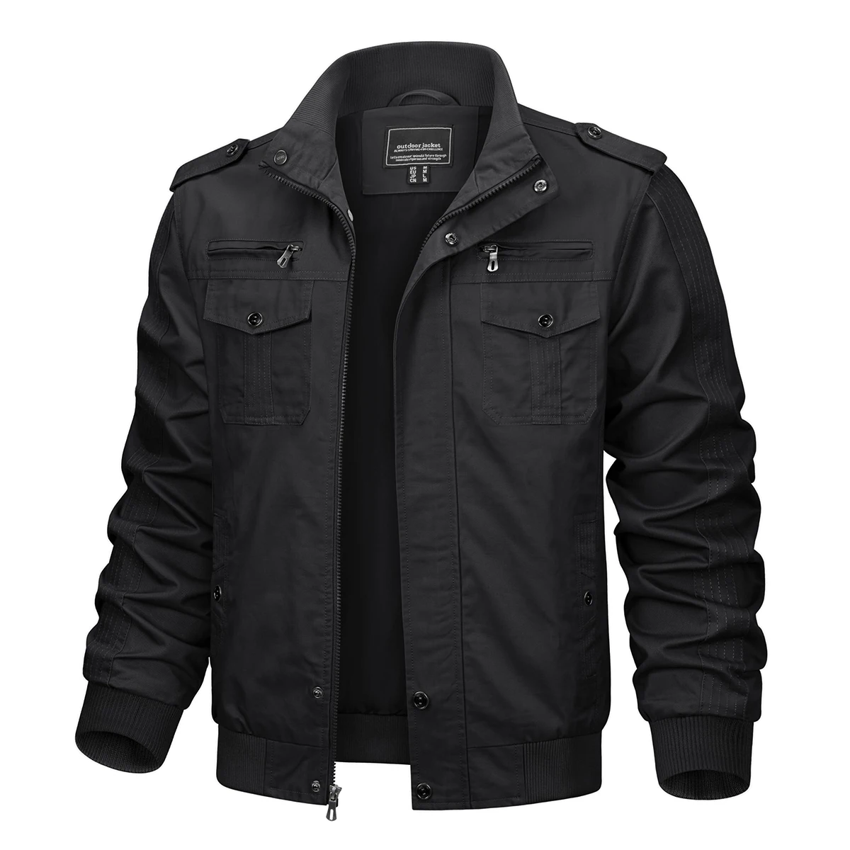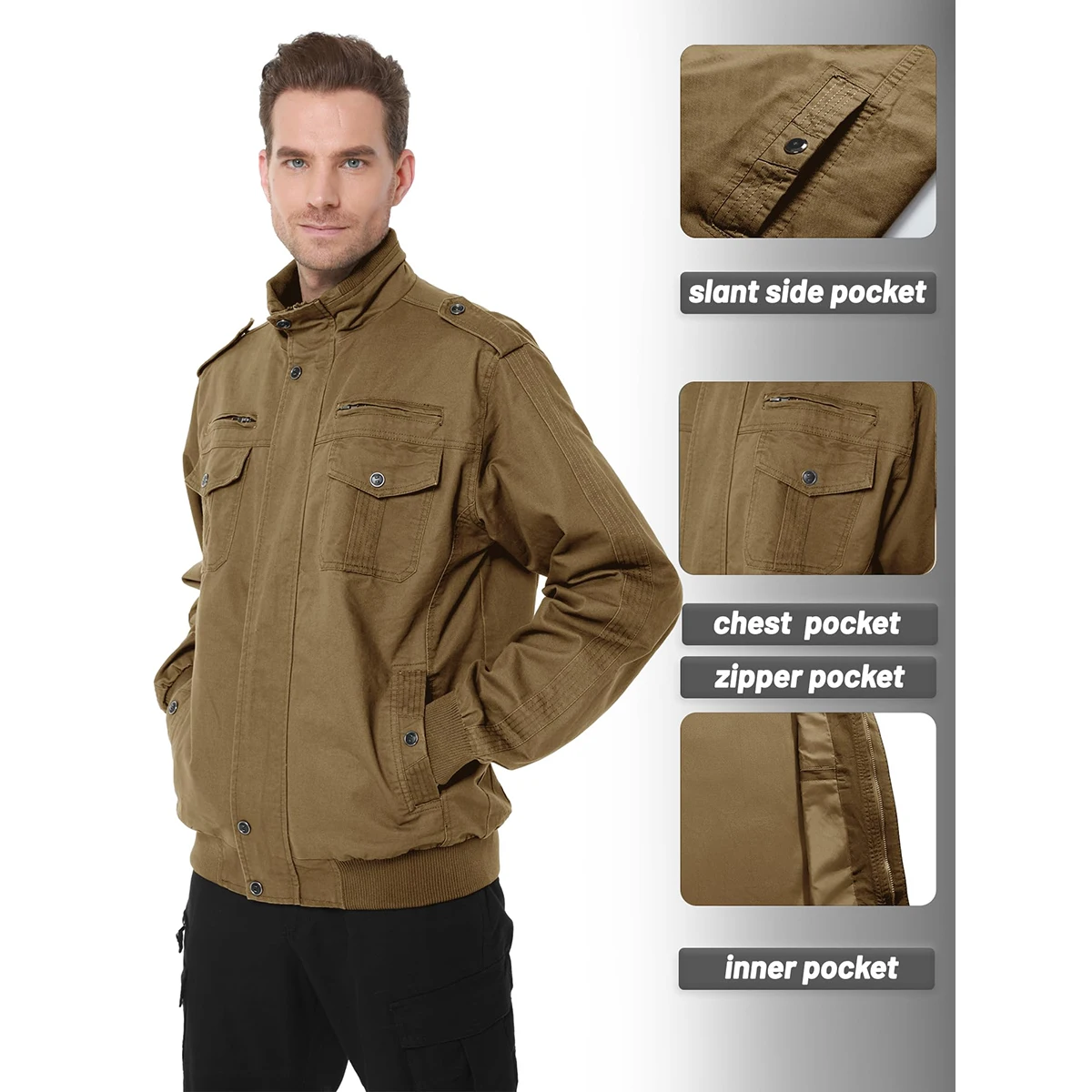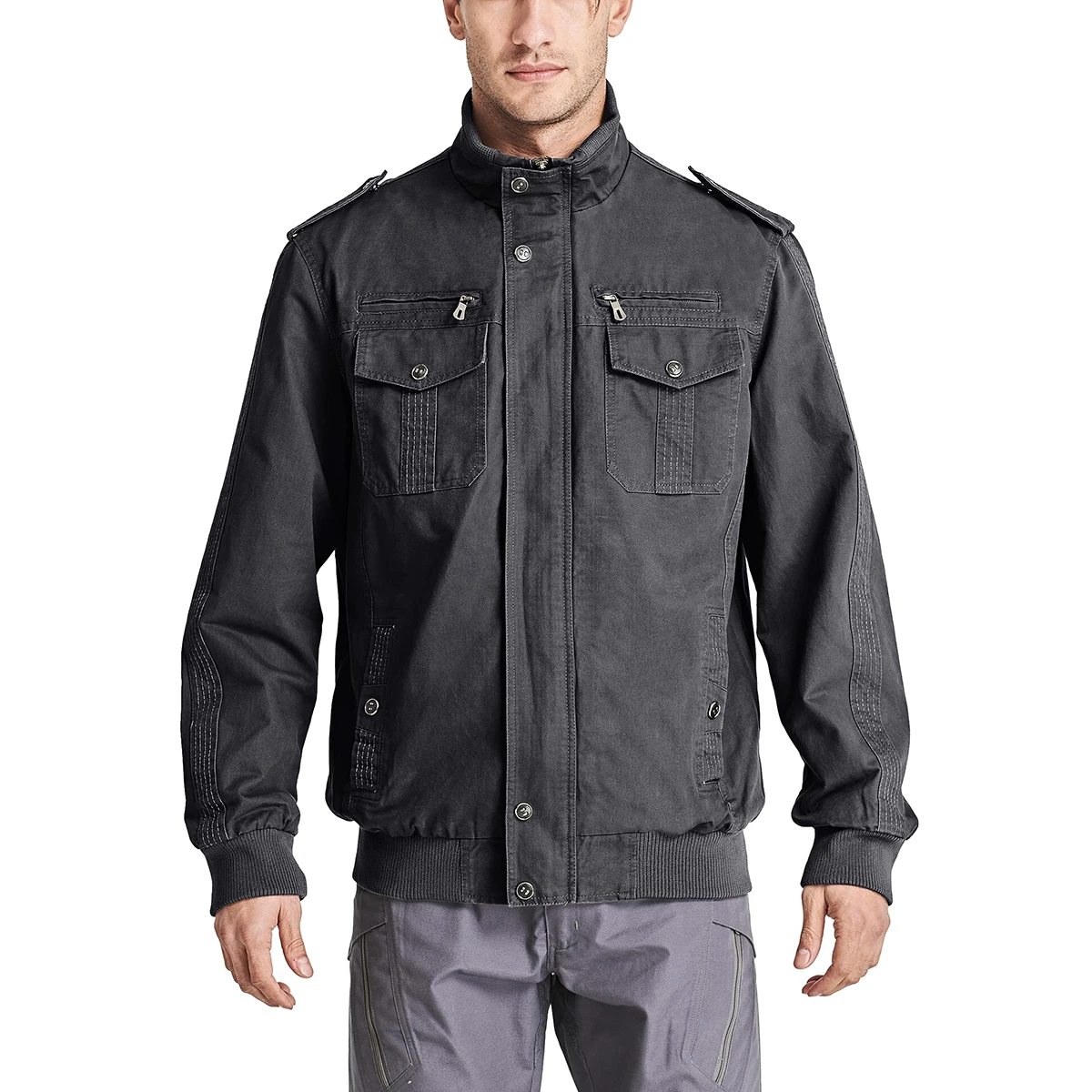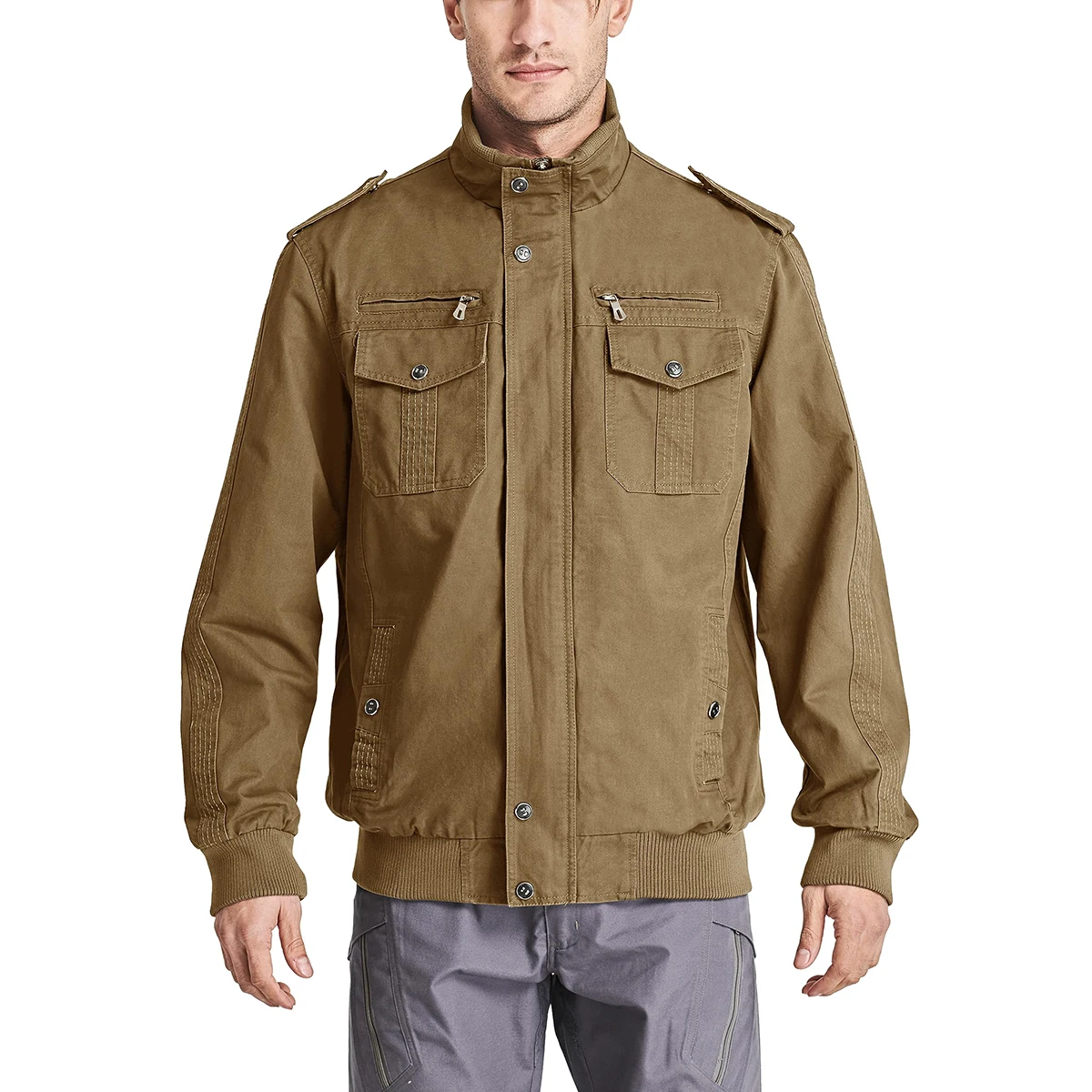 TACVASEN Autumn Men’s Bomber Jackets Cotton Lightweight Multi Pockets Zip Front Stand Collar Windproof Casual Work Cargo Jacket
