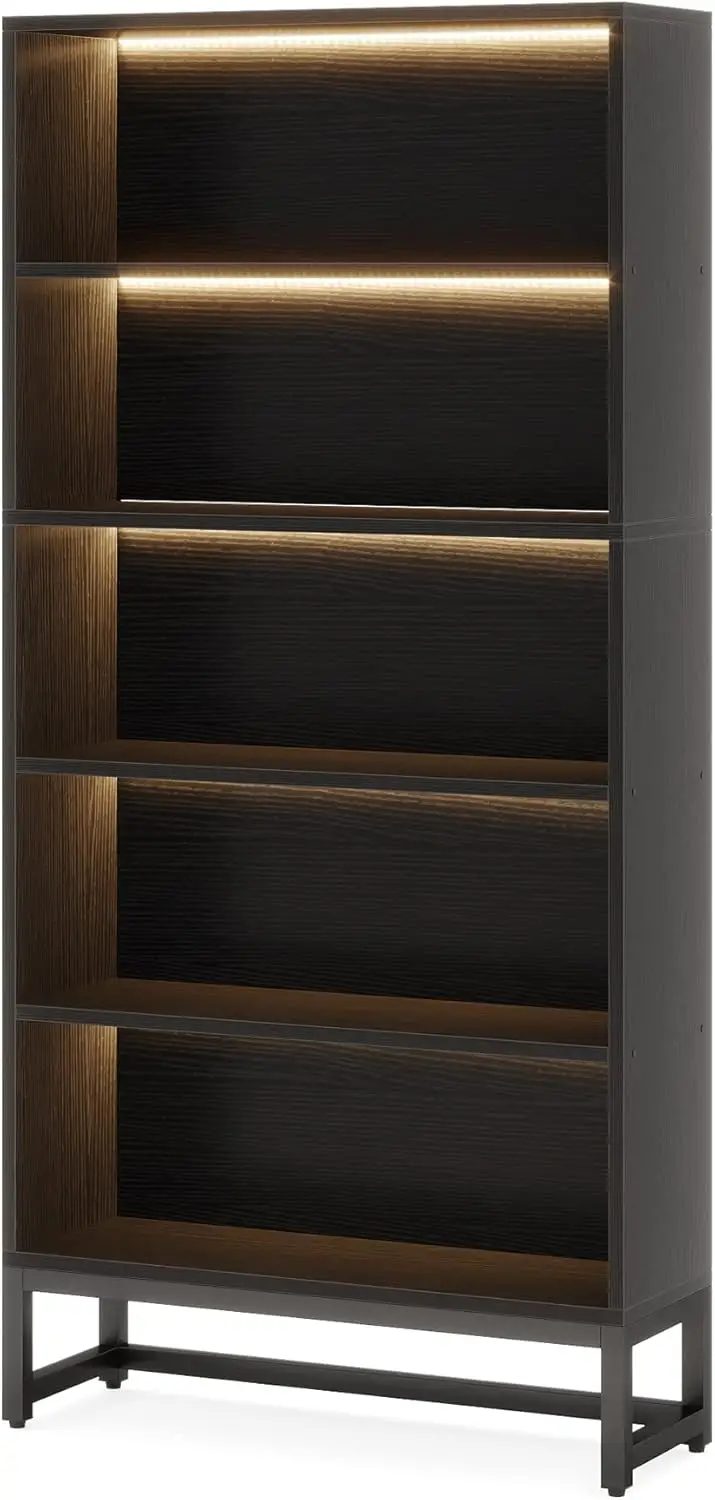 Tall Bookcase Black Bookshelf Large Bookcases with LED Lights Heavy Duty Free Standing Library Bookshelf with 5 Tier Storage