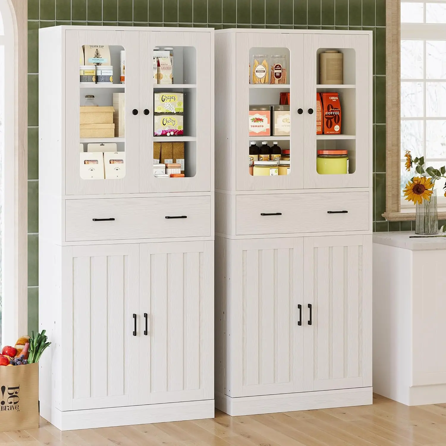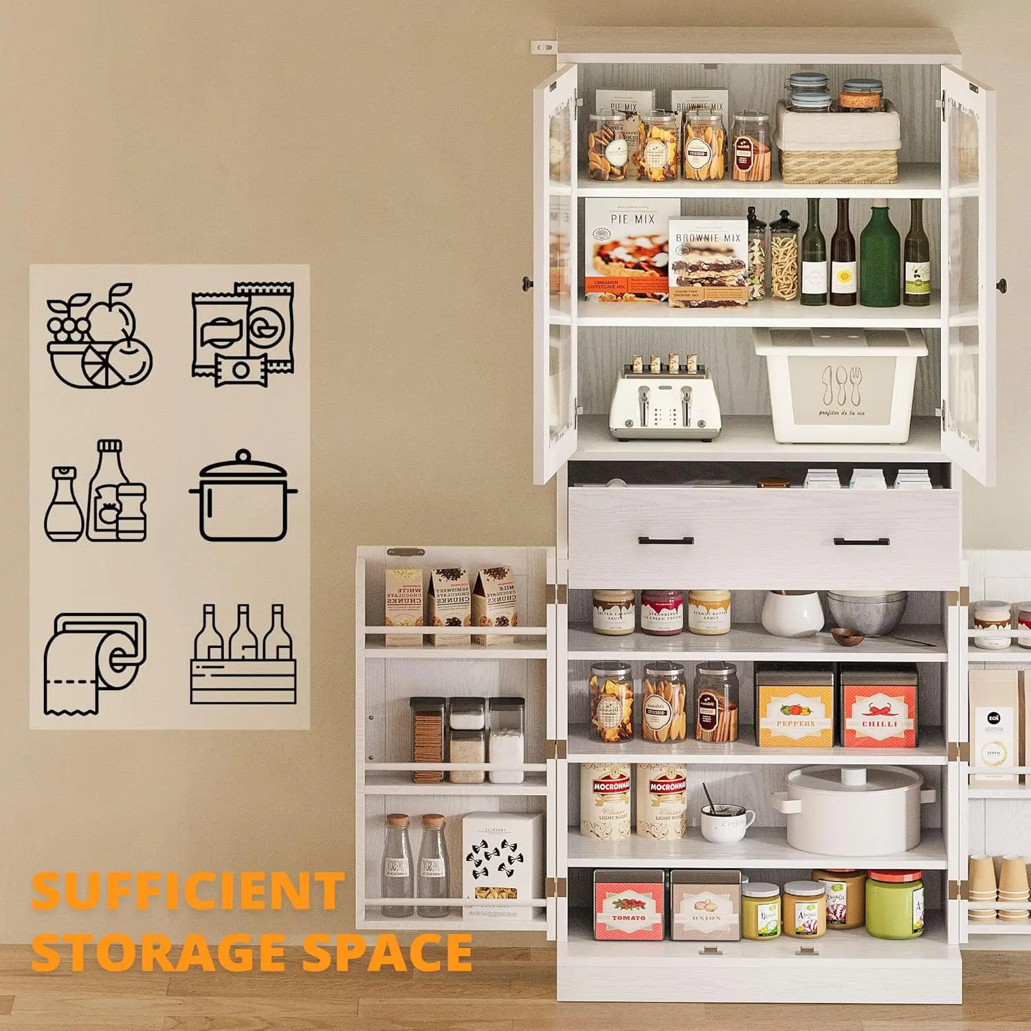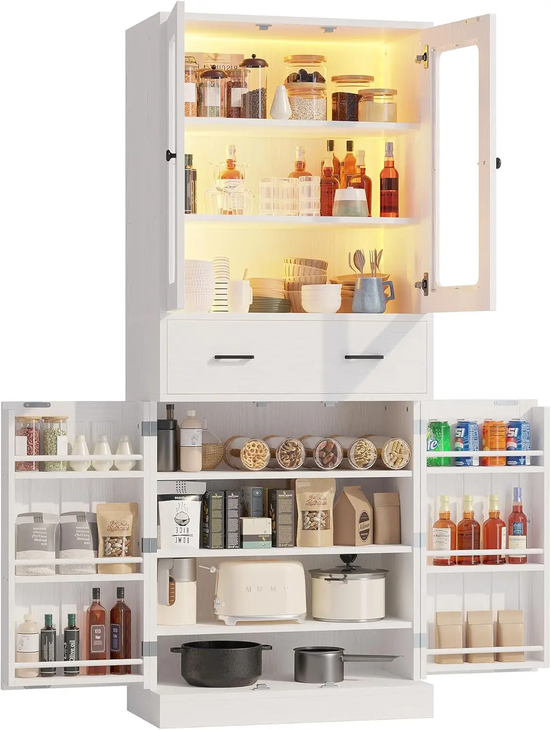 Tall Kitchen Pantry Storage Cabinet with LED Lights Acrylic Glass Door Drawer and Adjustable Shelves for Dining Room