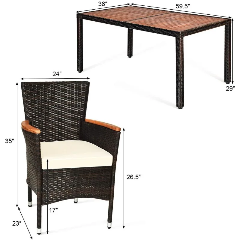 - Dimension of Wicker Dining Set: table – 59.5″ x 36″ x 29″ (L x W x H), chair – 23.5″ x 23″ x 35″ (L x W x H), height from floor to seat (include cushion): 17″, height from floor to armrest: 26.5″, Size of Cushion:19″x18.5″x2.4″(LXWXH), table weight capacity: 180 lbs, chair weight capacity: 355 lbs