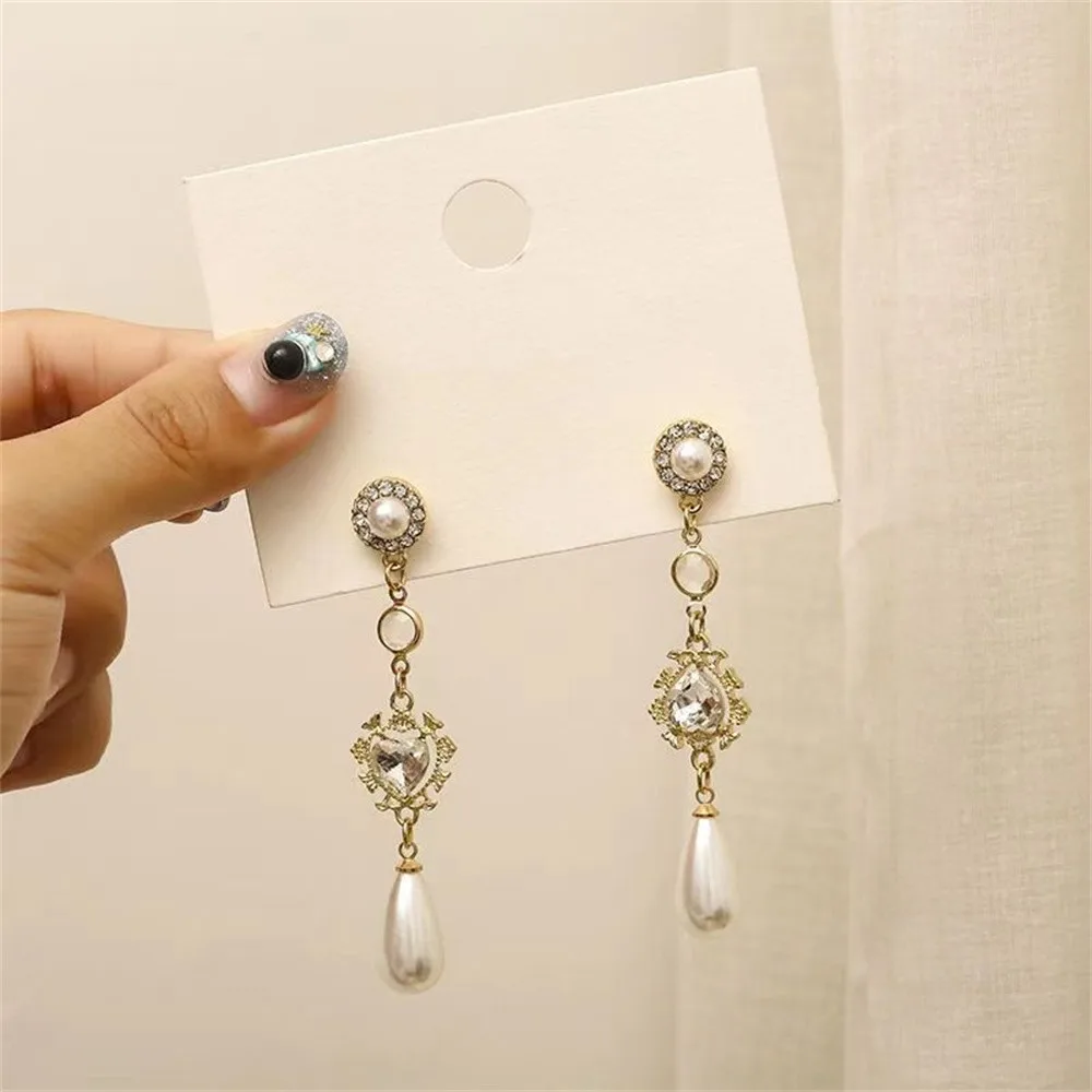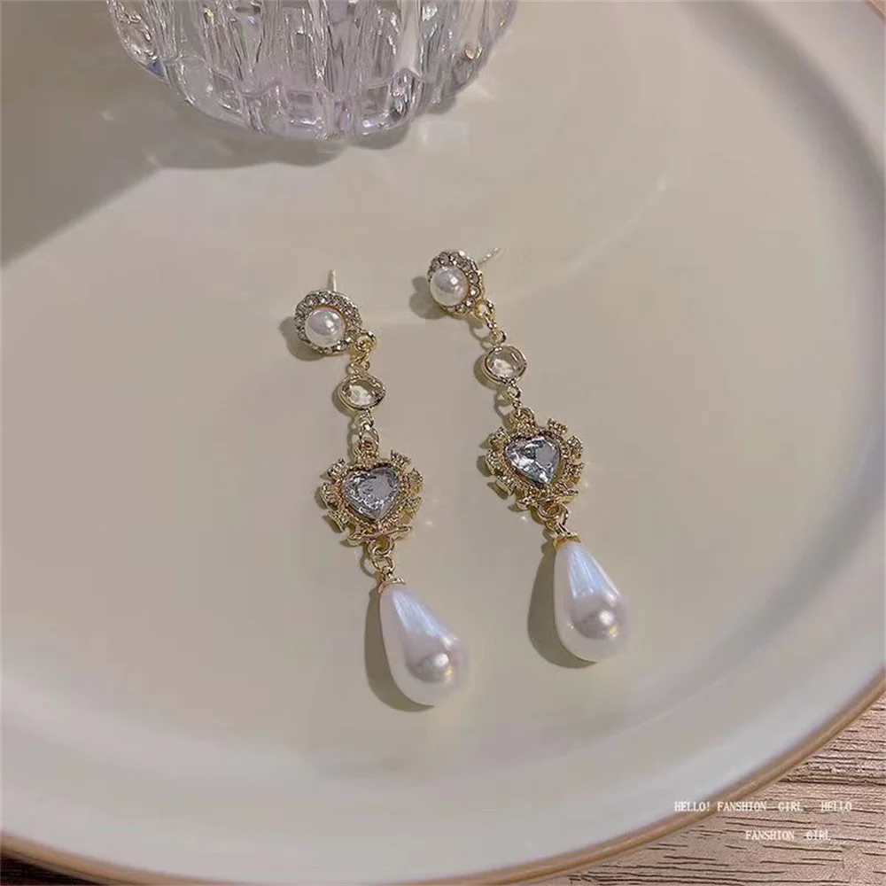Temperament Crystal Pearl Drop Earrings For Women Vintage Rhinestone Heart Pendant Earrings Retro Long Tassel Charm Jewelry Sets