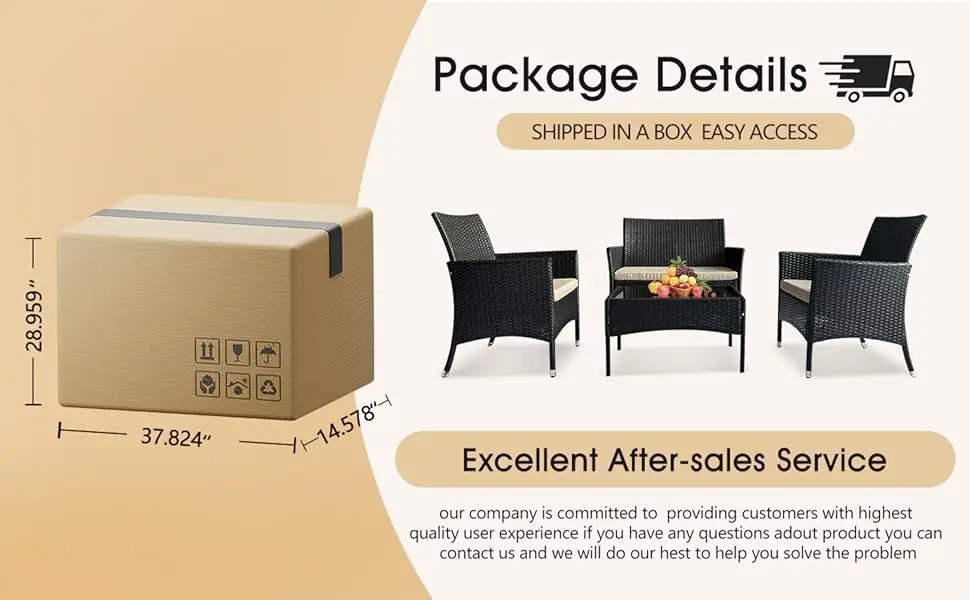 【Easy Assembly】This outdoor furniture set comes with all hardware & necessary tools. Follow the Instructions, You can easily and quickly assemble the patio sofa set. NOTE: When you try to install the patio furniture set, try to line the holes together on all sides, do not over-tight one hole, then try to tight it slowly on each side.