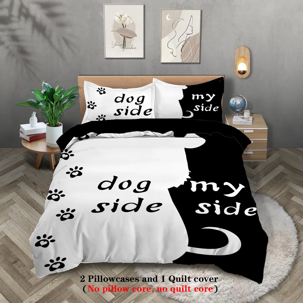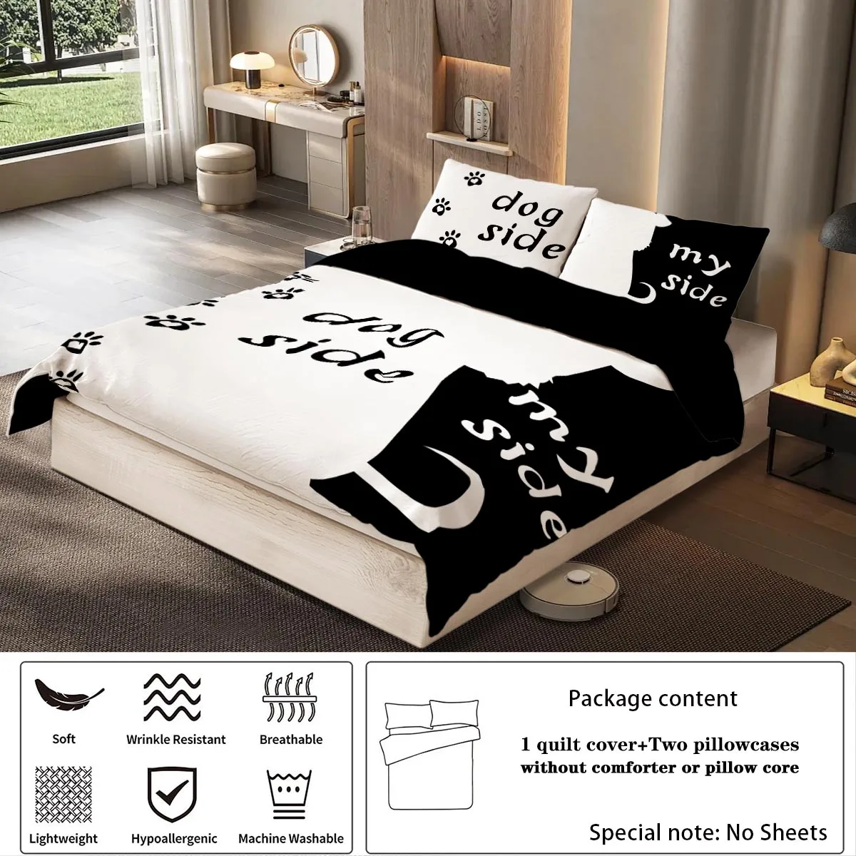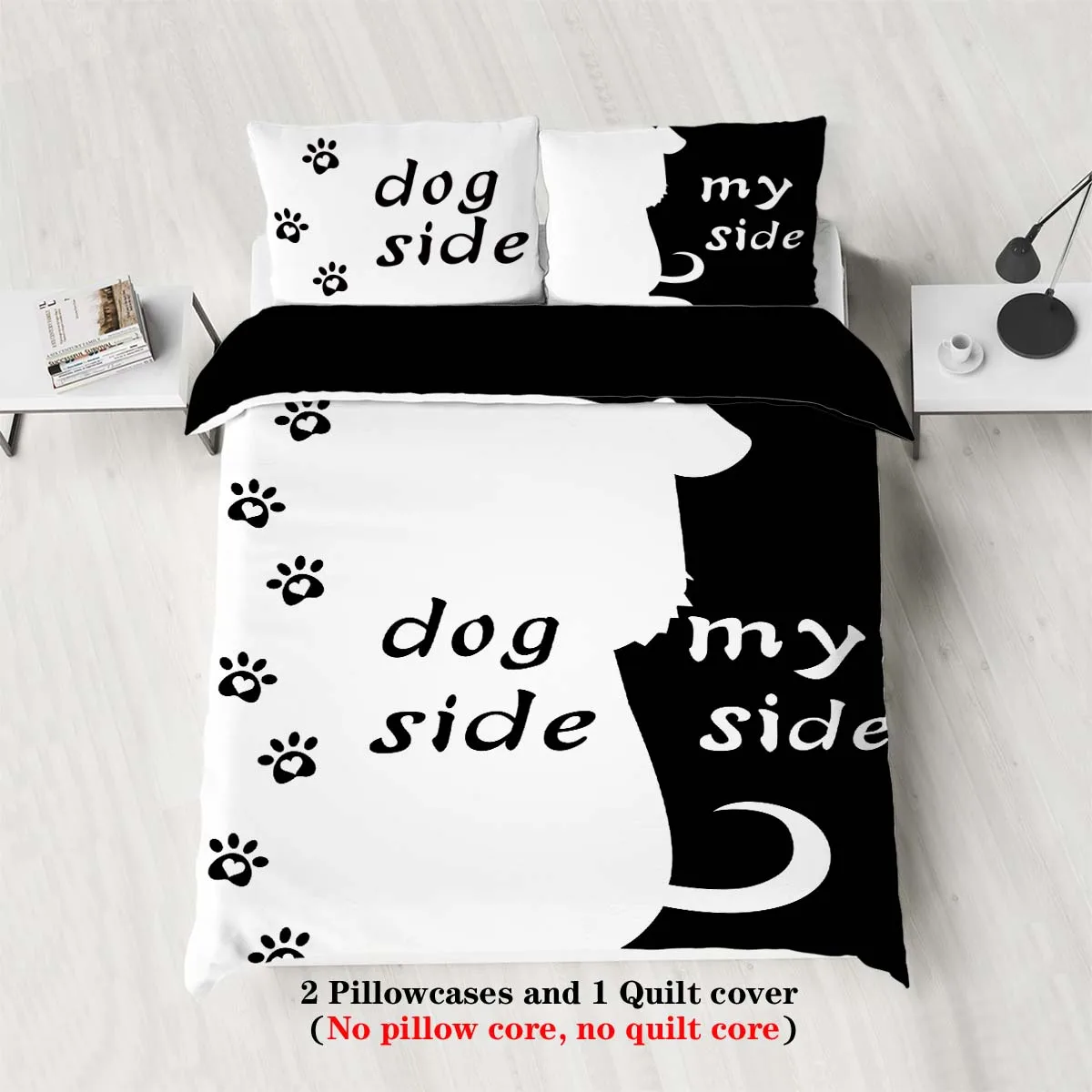 Three-piece set (1 duvet cover + 2 pillowcases, coreless), black and white dog element print bedding set, multiple sizes