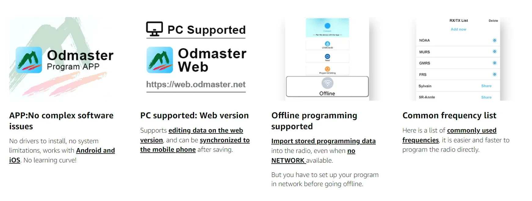 ✔ 【APP works with your mobile phone to quickly program】 anytime and anywhere quickly connect to the nearest repeater, customise the buttons of the radios, share the frequency scheme between the same models, and more function. More convenient and smarter than Chirp, you can use Web Odmaster batch prog on PC.