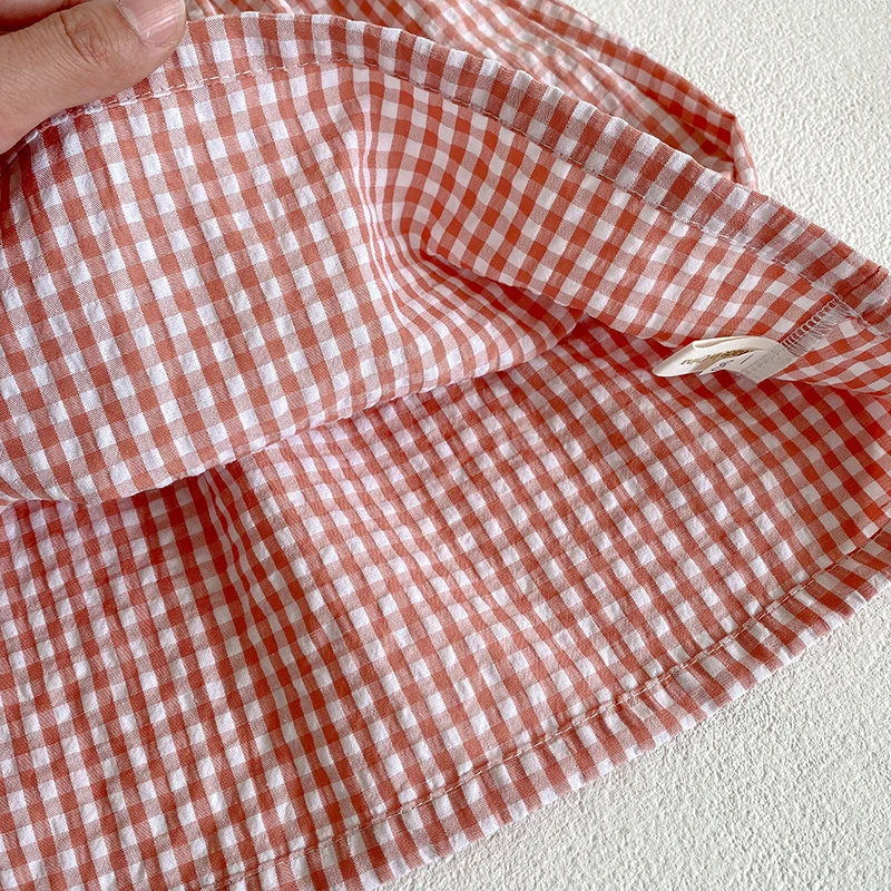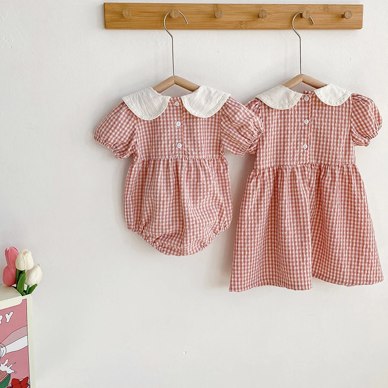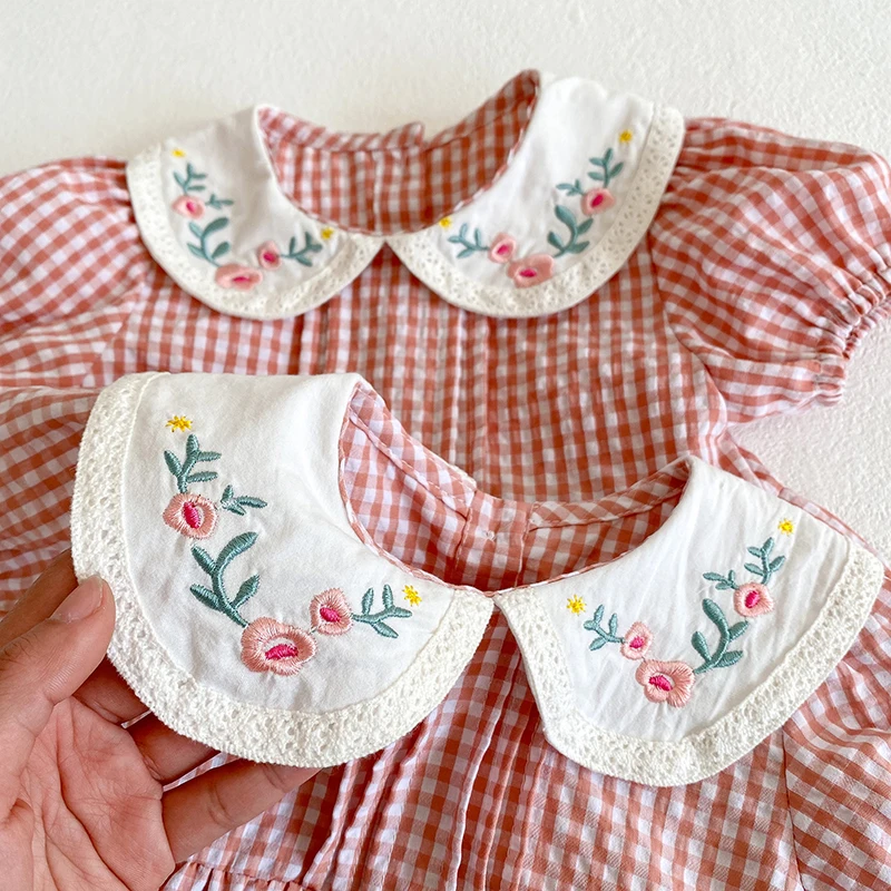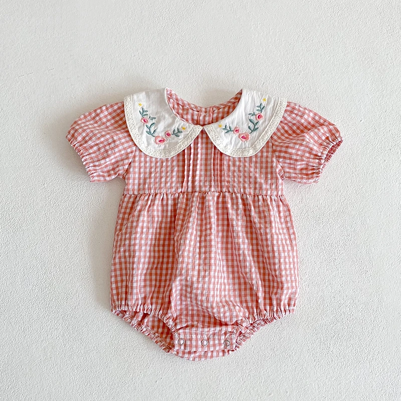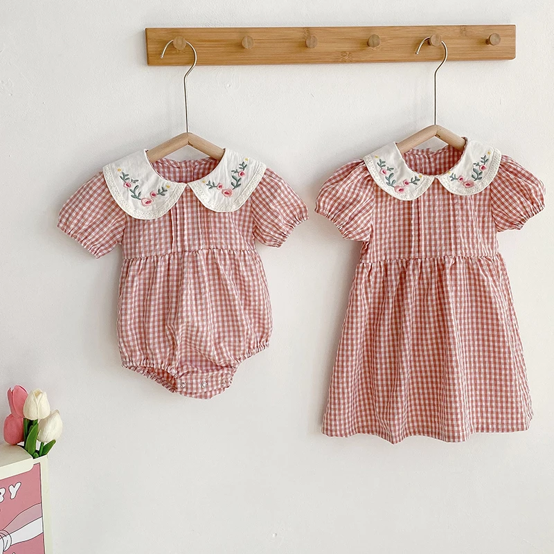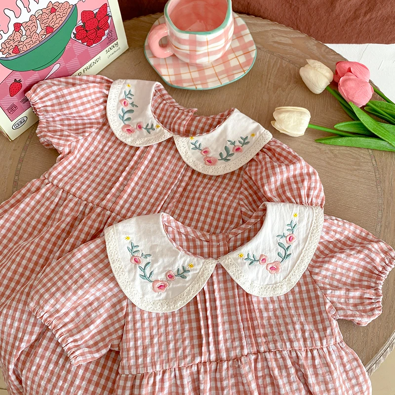 Toddler Baby Girls Grid Embroidery Dresses Summer Girl Baby Romper Infant Children Cotton Short Sleeve One-piece Romper