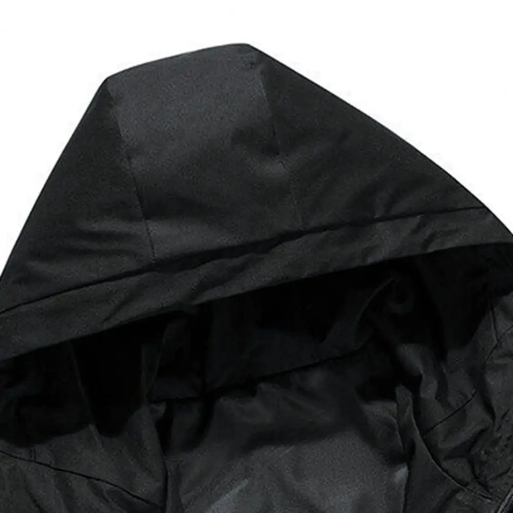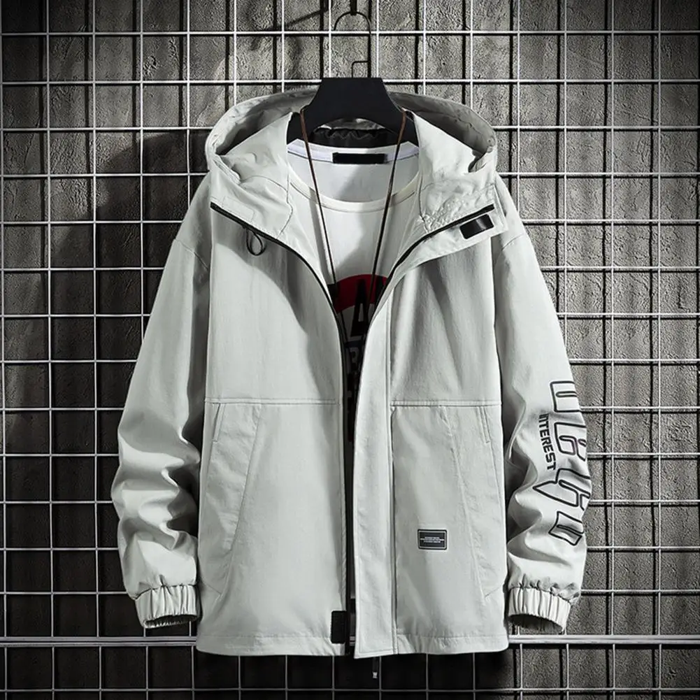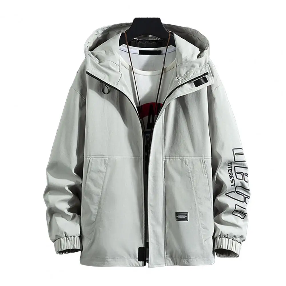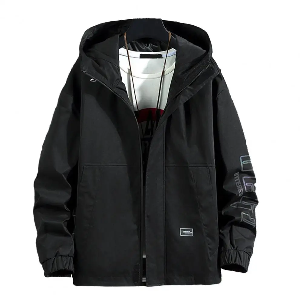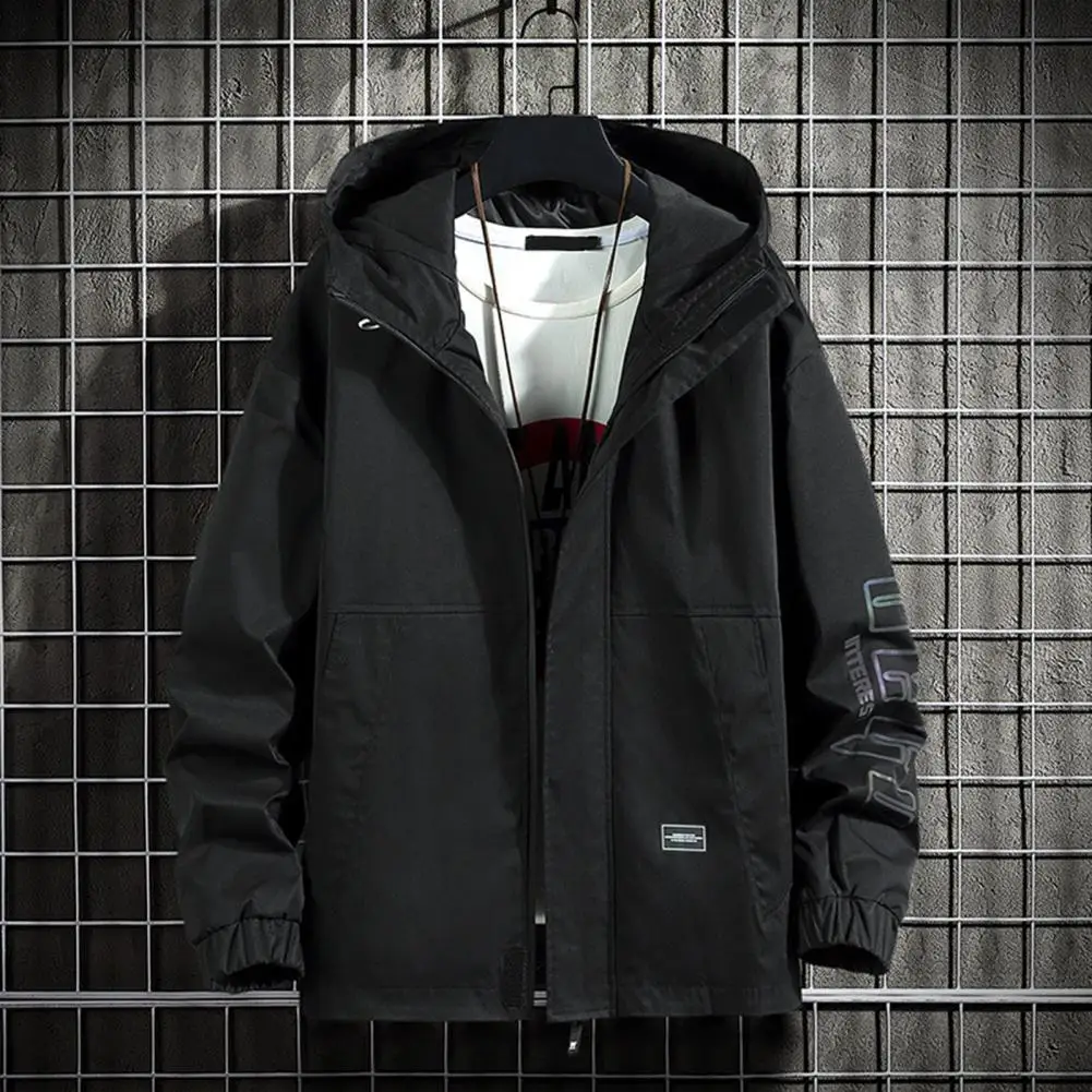 Men Jacket Hooded Collar Long Sleeve Pocket Zipper Closure Letter Print Thick Warm Cardigan Loose Mid Length Casual Men Coat