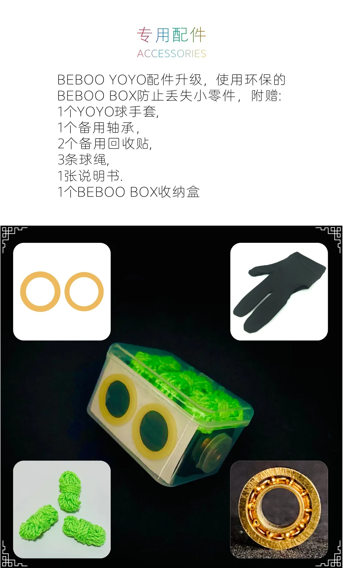 BEBOO YOYO accessories upgraded, using environmentally friendly BEBOO BOX to prevent the loss of small parts, comes with: