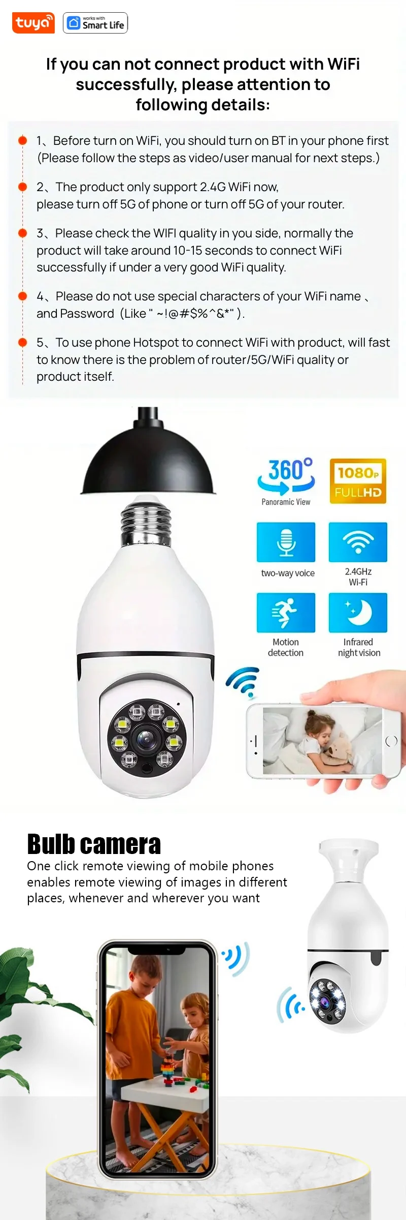 Tuya Smart 2.4G WiFi Indoor Camera Smart Home Security Video Surveillance Supprt 2 Way Audio Mobile Motion E27 Light Bulb Camera