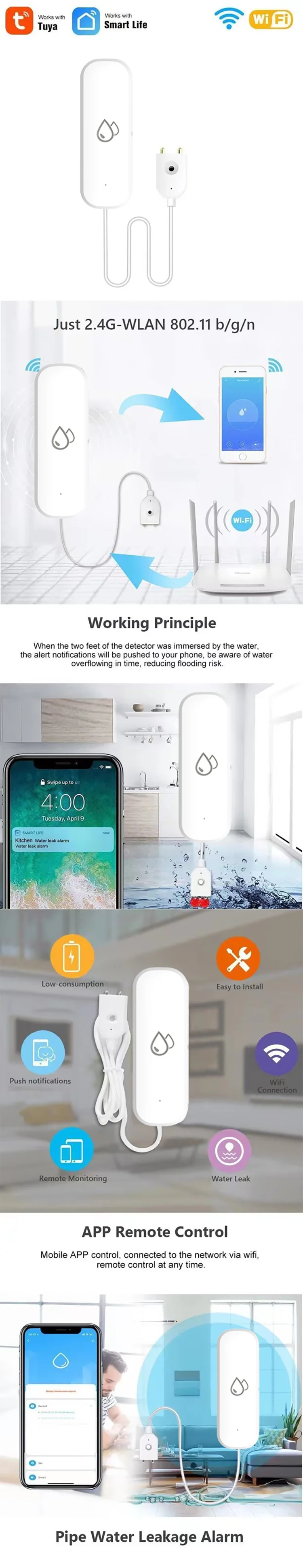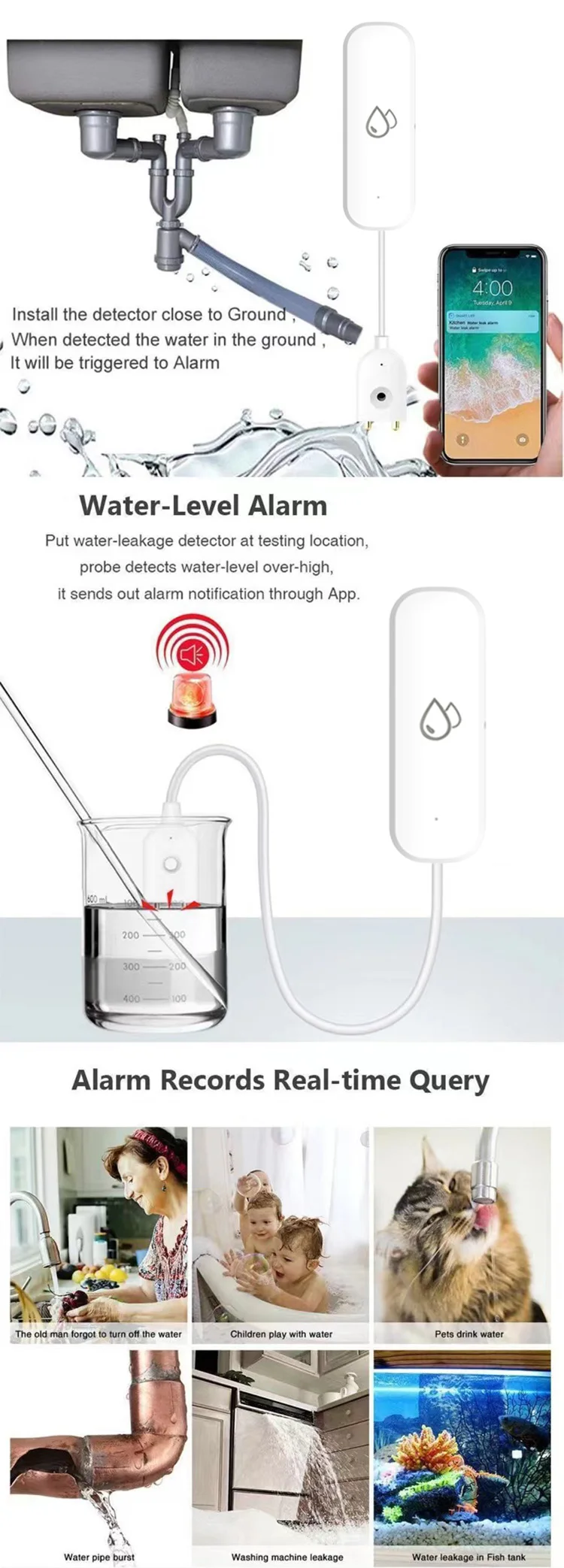 1.REAL-TIME MONITORING AND ALARM: The device connects via WiFi to monitor water levels and leaks in real time and sends an alert message to your cell phone as soon as an abnormality occurs, ensuring that you are able to take timely action to minimize potential damage.