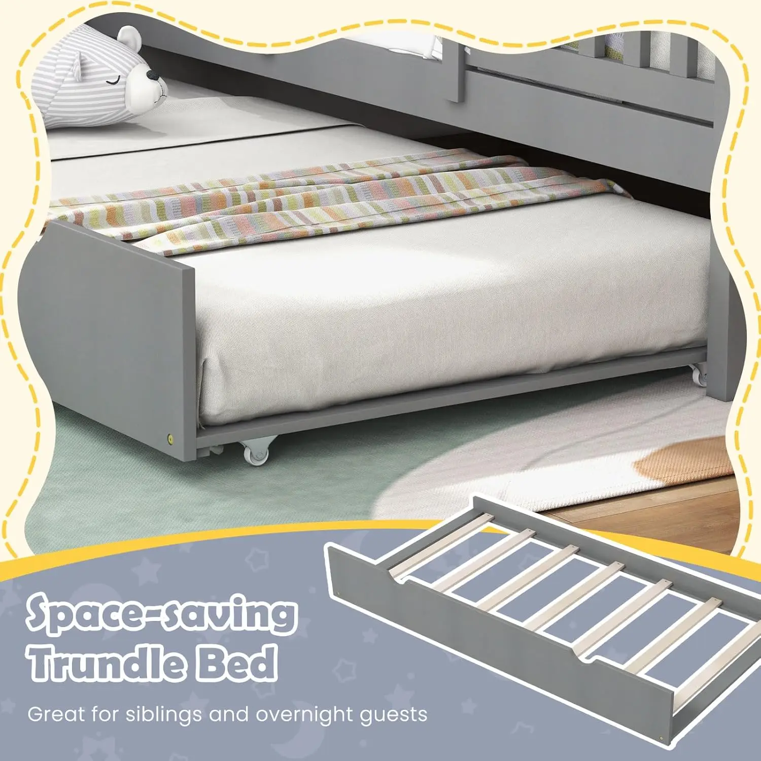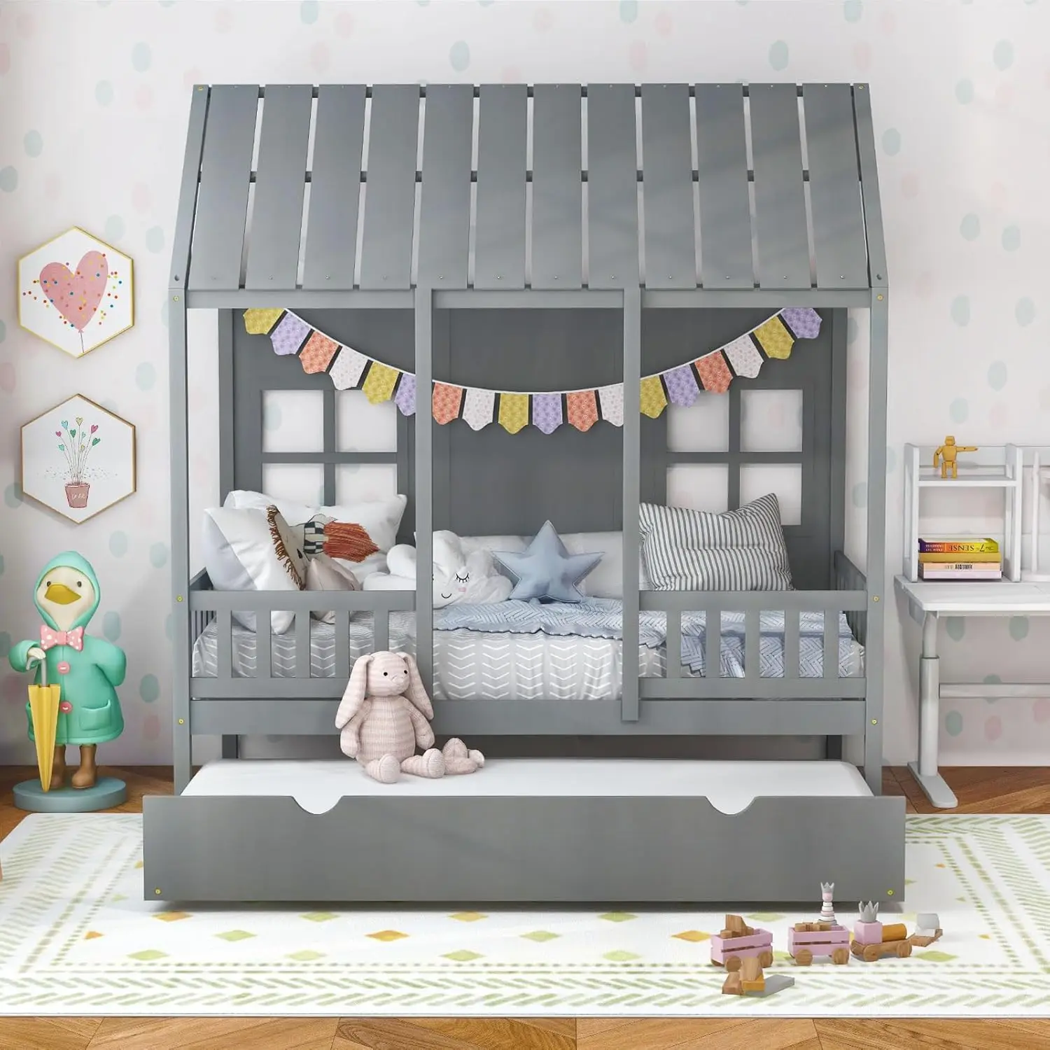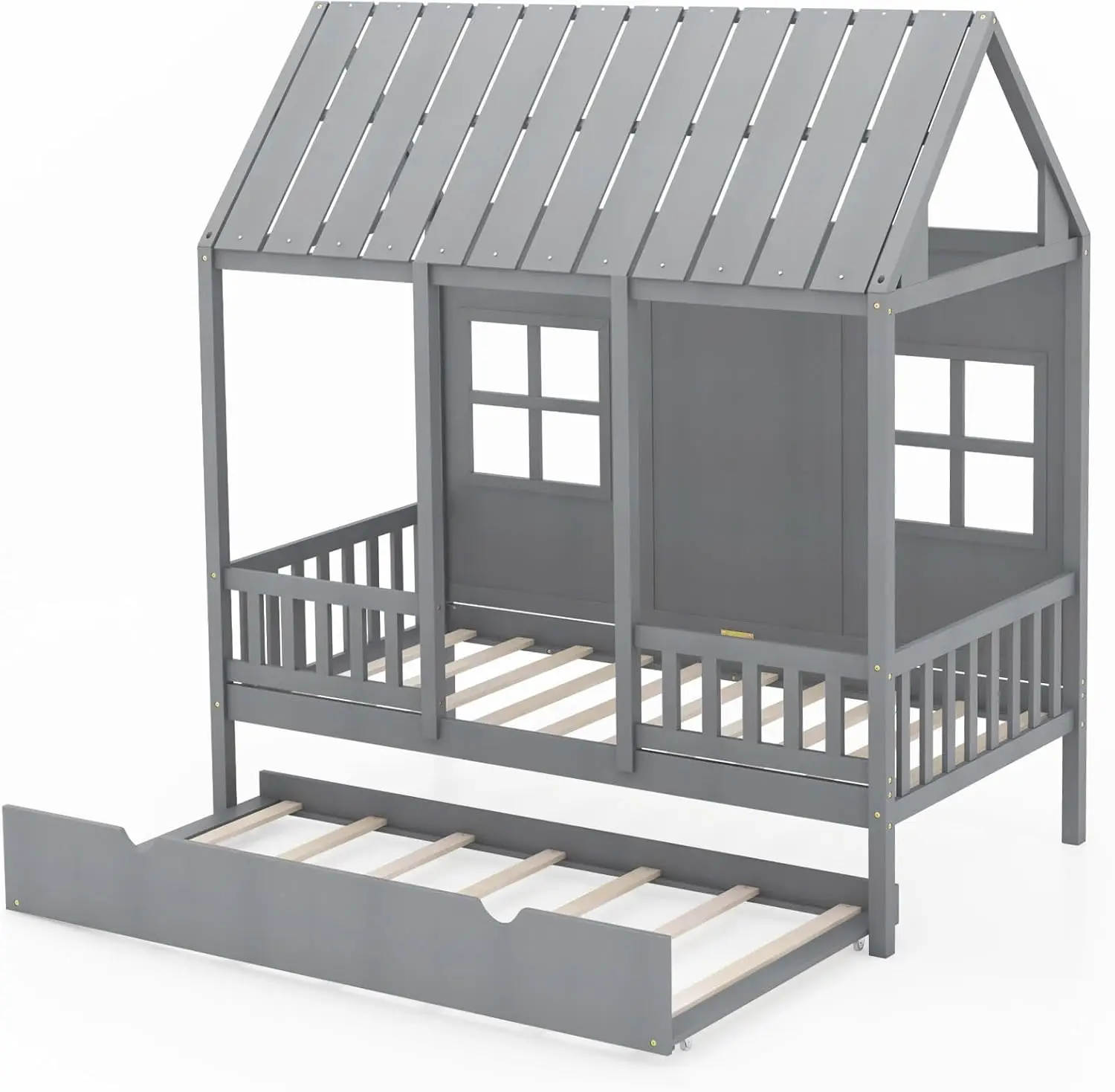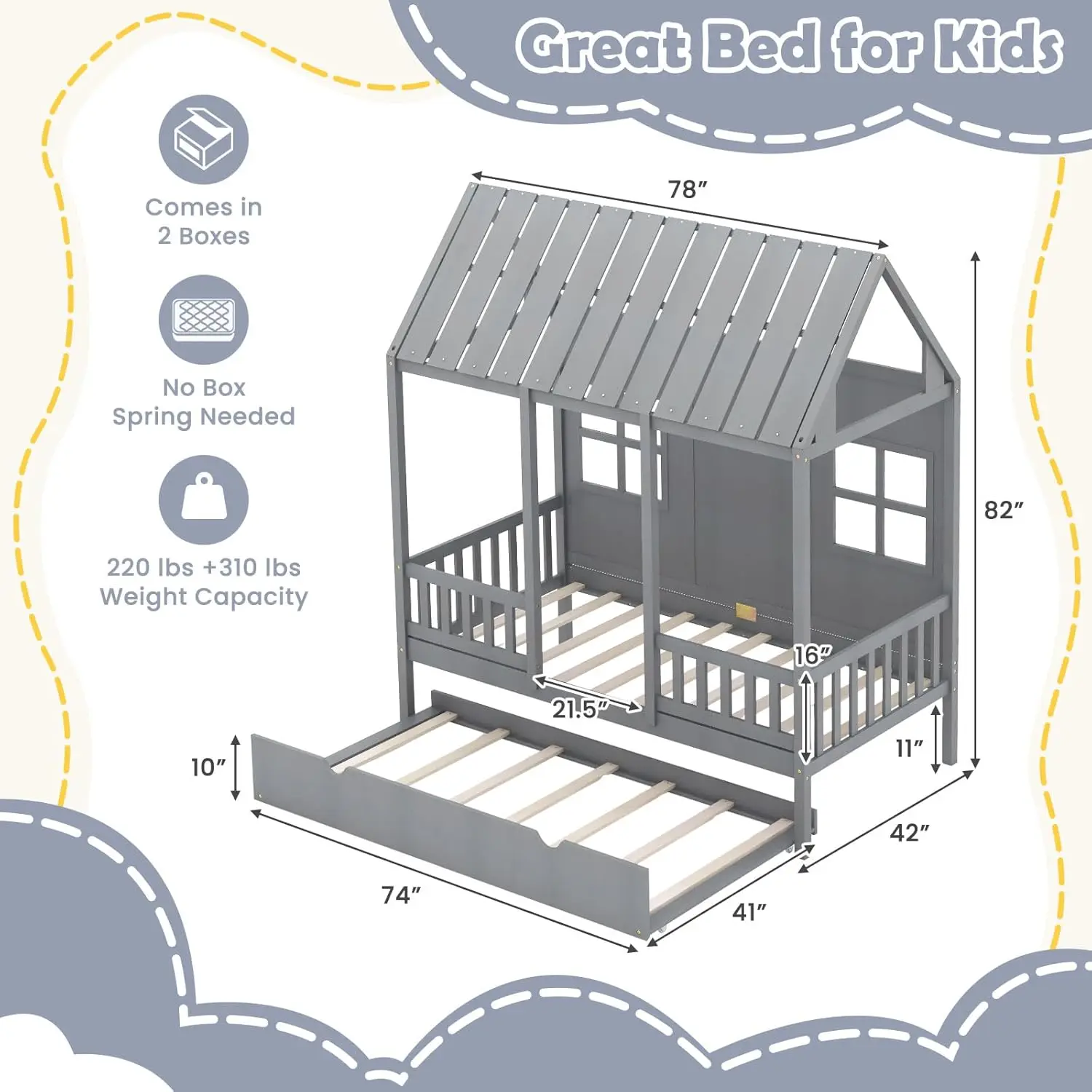 Twin House Bed with Trundle, Kids Bed Frame with 82″ Tall Roof, Windows and Guardrail, Wooden Playhouse Bed for Teens Boys Girls