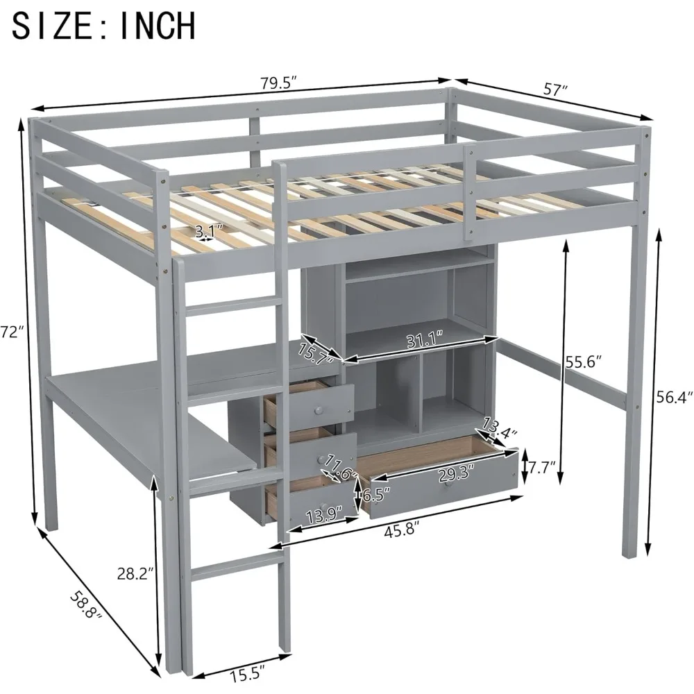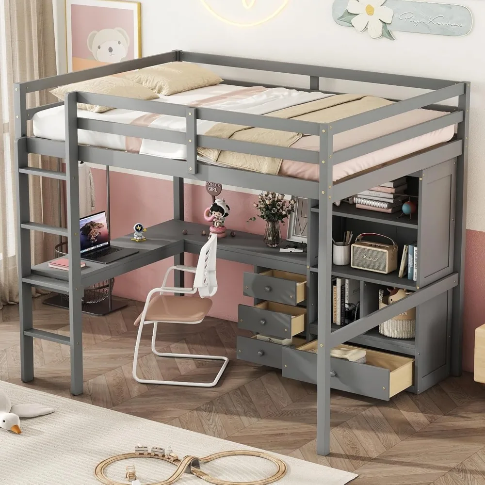 - [Full Loft Bed with Desk and Shelves]: This full size loft bed features a spacious L-shaped desk and bookcase, providing plenty of space for children to study or play and even store belongings. Ideal for space saving needs.