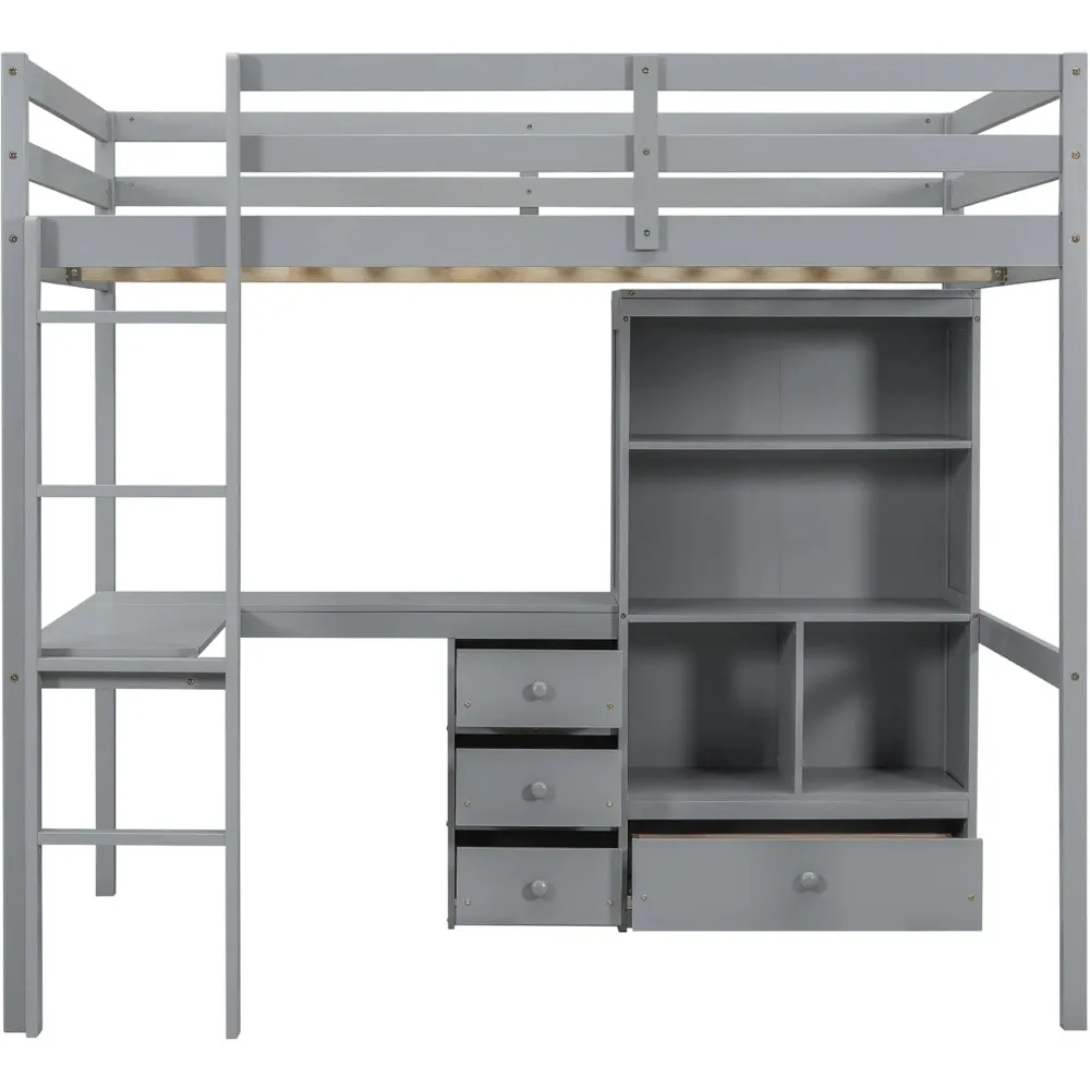 - [Loft Bed with Functional Storage]: In addition to 4-tier cabinets, the loft bed also has 3 storage drawers with rails to help keep the room organized. This wood loft bed not only provides a comfortable sleeping space, but also a spacious and practical workstation with powerful storage.