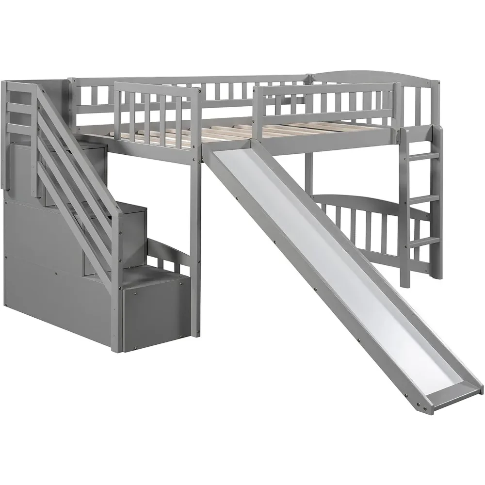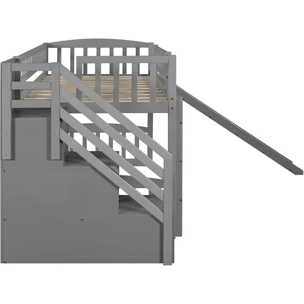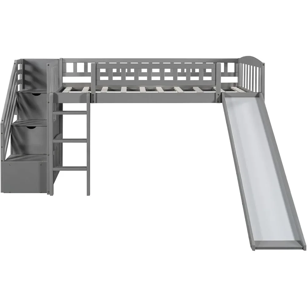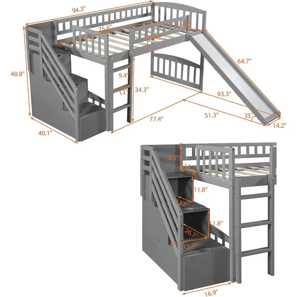 Twin Loft Bed with Slide for Kids, Wood Slide Loft Bed with Stairs and Built-in Ladder, No Box Spring Needed,Grey