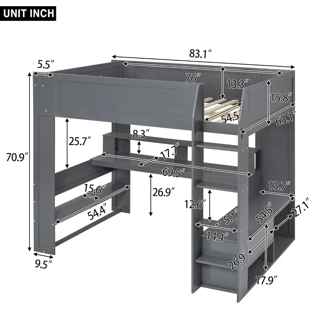 - 【Loft Bed with Desk and Outlets】This loft bed provides a separate personal space while satisfying the need for rest. The 2-tier desk with LED light strip and charging station, more convenient for work, study or game.