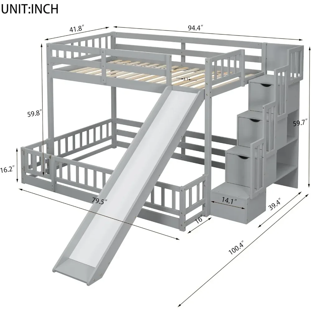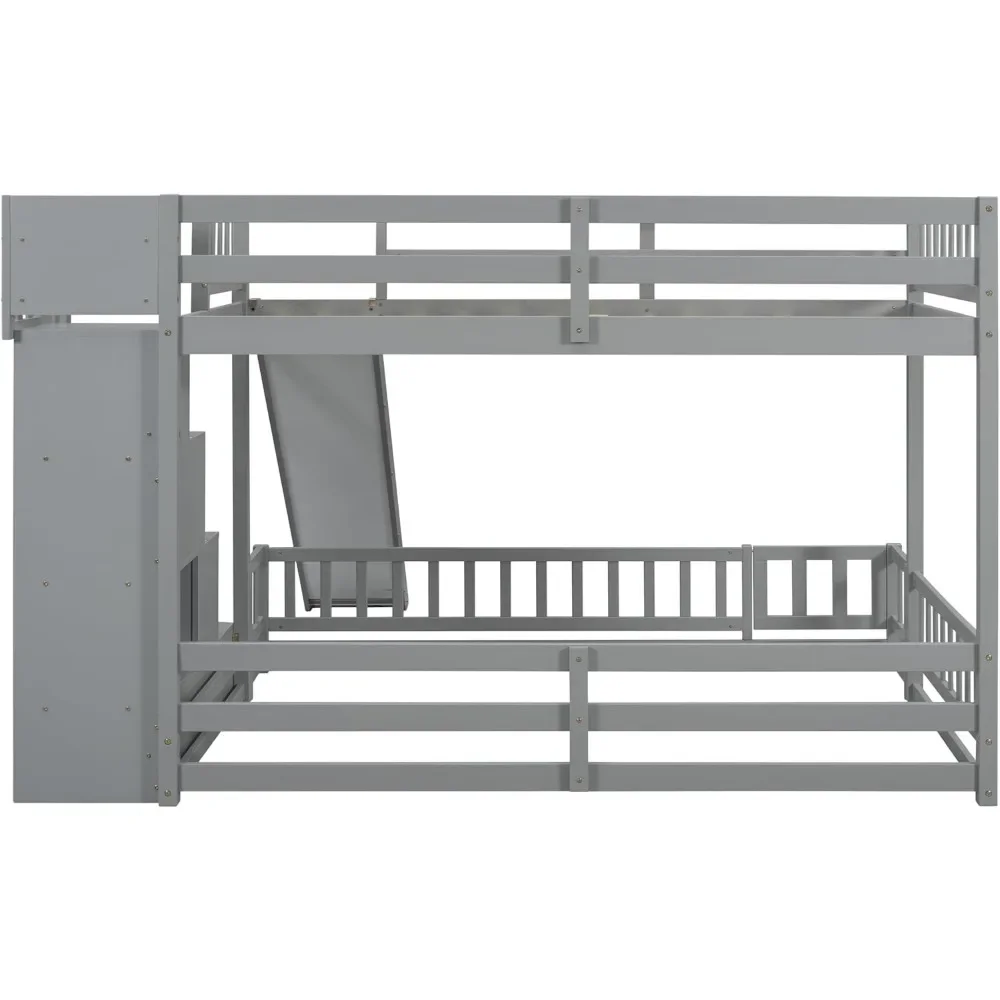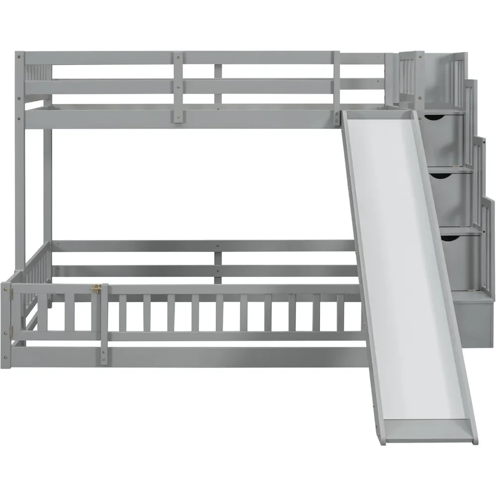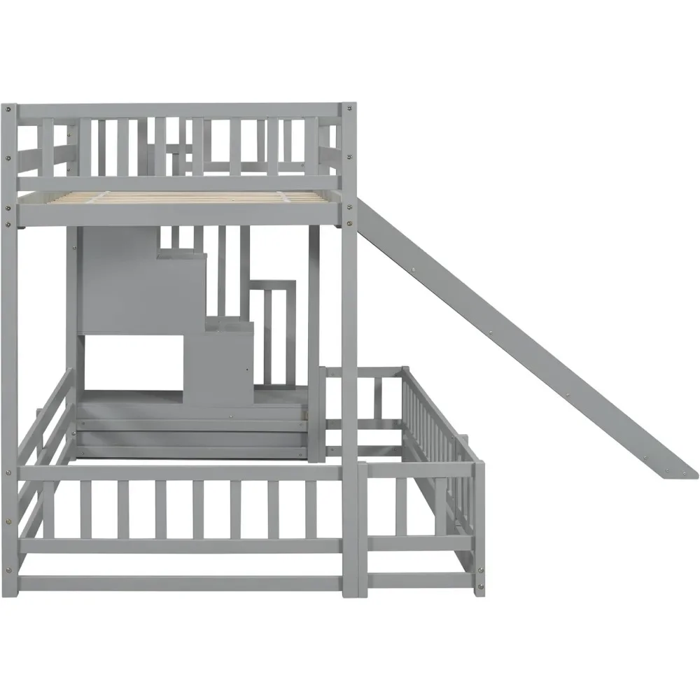 - Unique Bunk Bed Design with Slide: Our twin-over-full bunk bed offers a unique sleeping arrangement with an upper twin bed and a spacious floor-level full bed, both equipped with guardrails for safety. The design minimizes disturbance between sleepers and ensures optimal comfort. Additionally, it includes a slide with wooden safety panels and side guards, providing a smooth and secure descent for endless fun.
